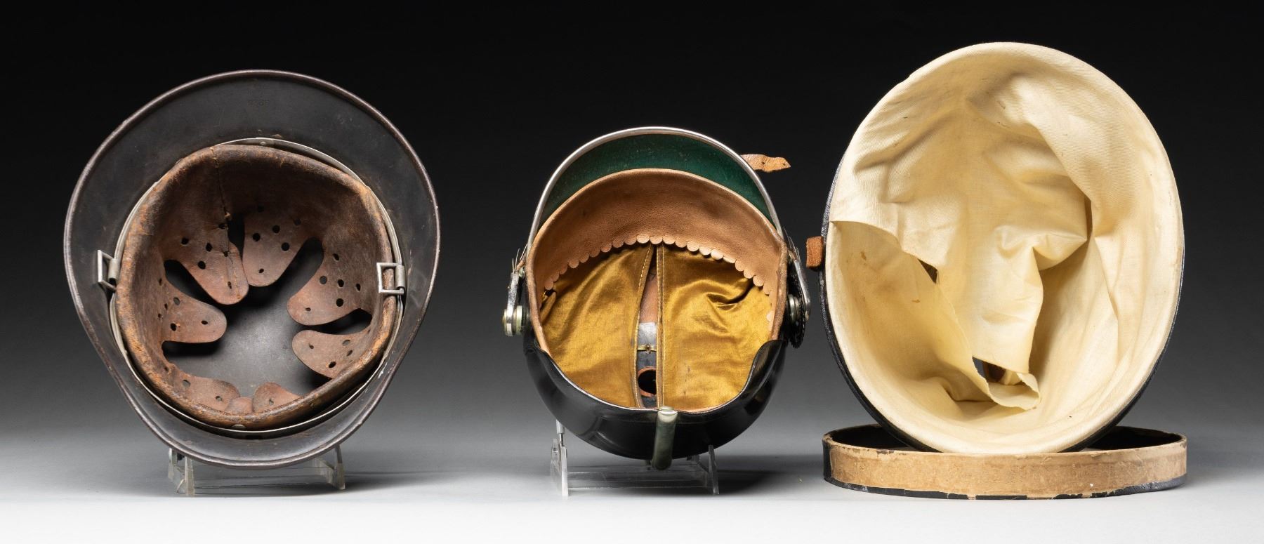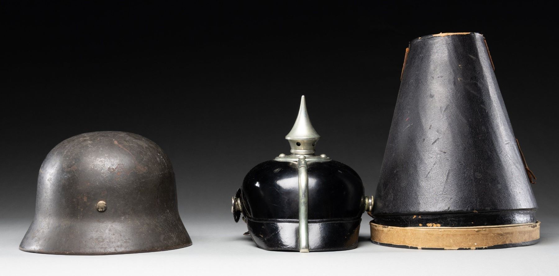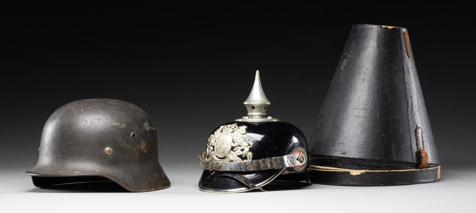 1) WWI Bavarian officer's grade spike helmet with all silvered trim possibly for a Pioneer regiment. The spike has a round base with 4 rivets and connects to a silvered backstrap. Silvered Bavarian front plate with silvered chin scales and visor trim. There is one national kokard present. The interior has a tan leather sweat band with a silk crown liner. Helmet comes with its original black helmet case. CONDITION: light wear overall. The case is missing all straps and the top cover of the case. 2) A nice WWII German M1935 battle helmet field gray with no evidence of ever having decals. The interior rear is stamped "3225" and the interior left is stamped "Q64". Full original liner but no chinstrap. CONDITION: helmet finish is about 85%. Liner is dry but solid. (02-24113/BF). NON-GUN. $800-1,200.