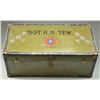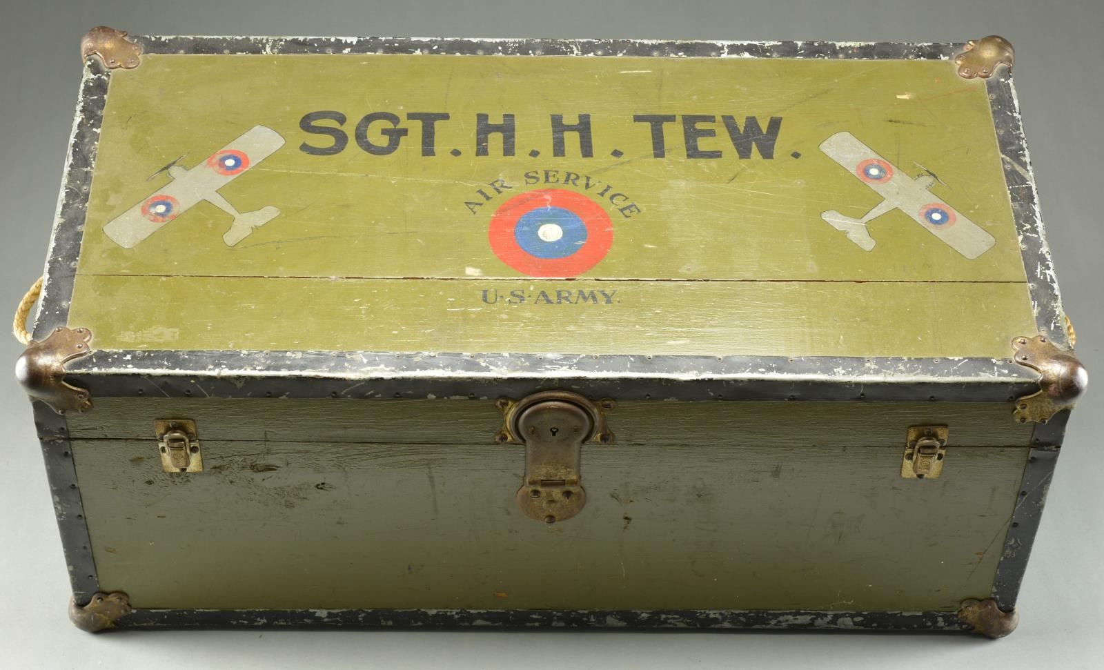 This lot includes a painted OD green box measuring 32” x 16” x 13” high with painted black metal trim and rope handles on each end. Top of box is painted “SGT. H.H. TEW” with 2 birds’ eye views of biplanes and a red, white & blue Air Corps circle with “Air Service” above & “U.S. Army” below the circle. Interior of box is plain wood with what appears to be a perpetual paper calendar tacked to the top left corner. The trunk contains 8 pairs of WWI pants. Most of the pants appear to be officer style with lace-up or button calves. Furthermore, the contents include a WWI U.S. Army signal flag kit, WWI Navy chief petty officer cap, and WWI green cotton underwear. CONDITION: trunk shows expected wear particularly on the edges of the trunk. Personalized painting remains sharp with vivid colors. Pants show wear but no abuse. Other items show light wear. (02-16859/BF). $300-500.