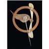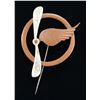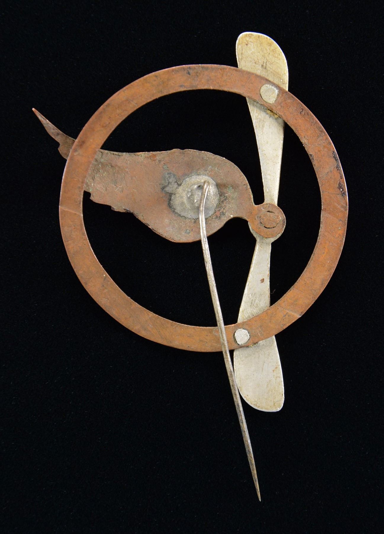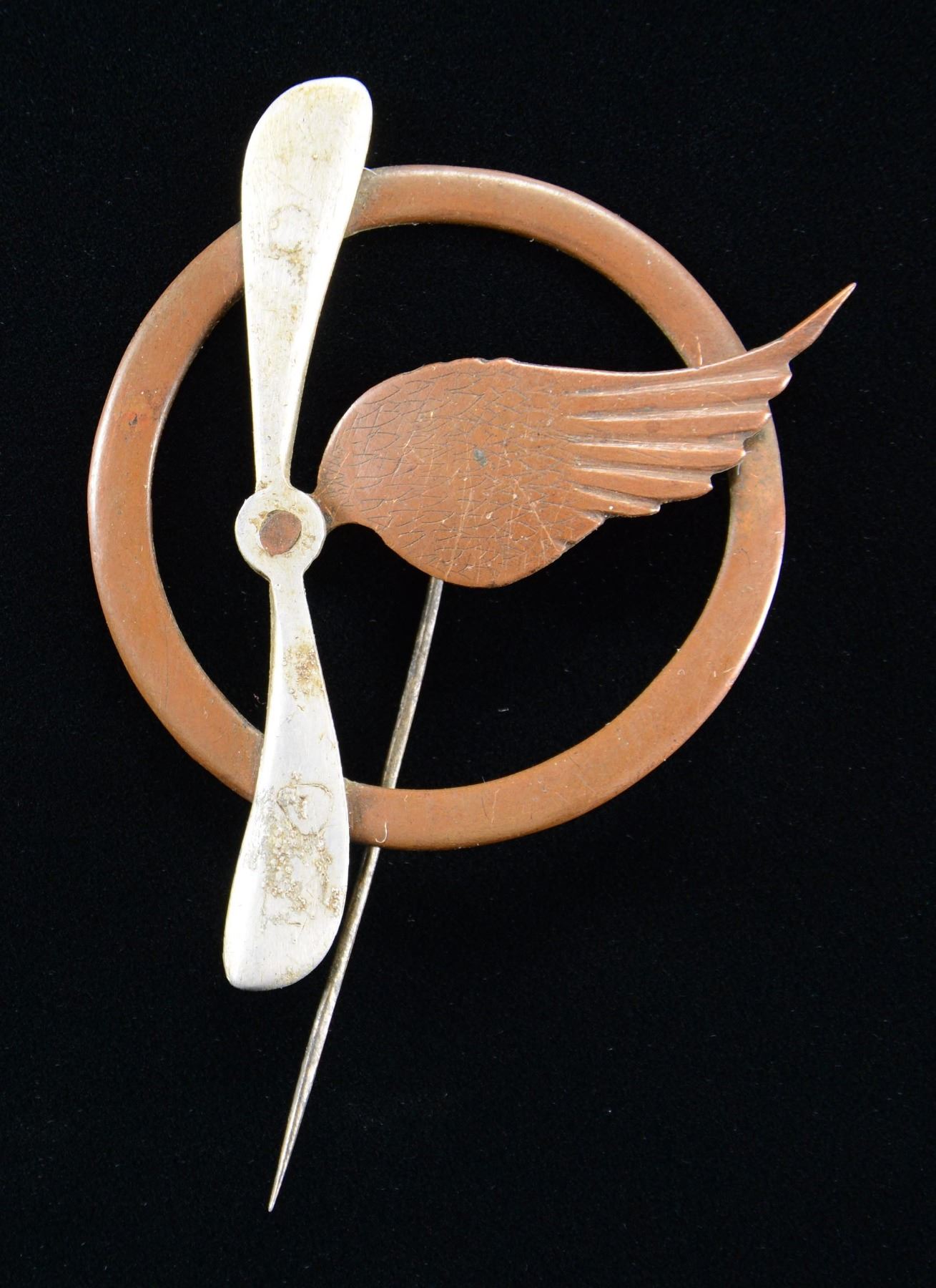 This 1912-1916 badge measures approx. 2 1/8" x 2 3/8", excluding the pin. The badge appears to be copper with a silver propeller. It depicts a large, vertical propeller with a single hand-engraved bird’s wing to the right, superimposed over a plain ring. The rear of the badge has a single, straight 2 1/4" pin in the center. CONDITION: badge is very slightly misshaped and has a pleasing, untouched patina. (02-22996/BF). $800-1,200.