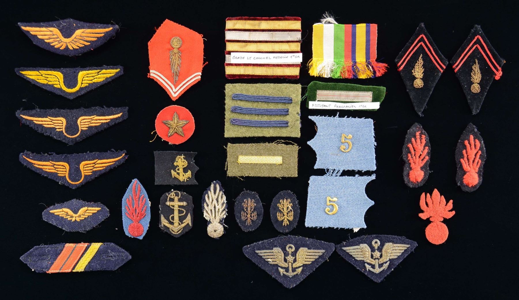 FRENCH UNIFORM INSIGNIA. 1) Two gold bullion on black cloth French aero insignia from WWI to the 1920s. The insignia features a winged anchor with a small central star. The reverses have a cream-colored backing material. CONDITION: wings show light wear. (02-23007/BF). 2) This varied group of cloth insignia features 5 sets of aviation wings. / 1 Shoulder tab. / 2 Red flaming bomb insignia on black. / 1 Bullion flaming bomb insignia on red. / 1 Flaming bomb insignia on blue. / 1 Bullion star on red. / 2 Bullion anchors on black. / 1 Silver bullion flaming bomb on black. / 1 Red felt flaming bomb insignia. / 2 Bullion flaming bomb collar tabs. / 2 False embroidered number "5" insignia on light-blue collar tabs. / 2 Bullion insignia on black. / 4 Various sleeve rank insignia. / 1 Section of British medal ribbon. CONDITION: insignia generally shows light to moderate wear with some insect damage. (02-23008/BF). $600-1,000.