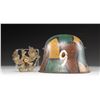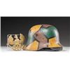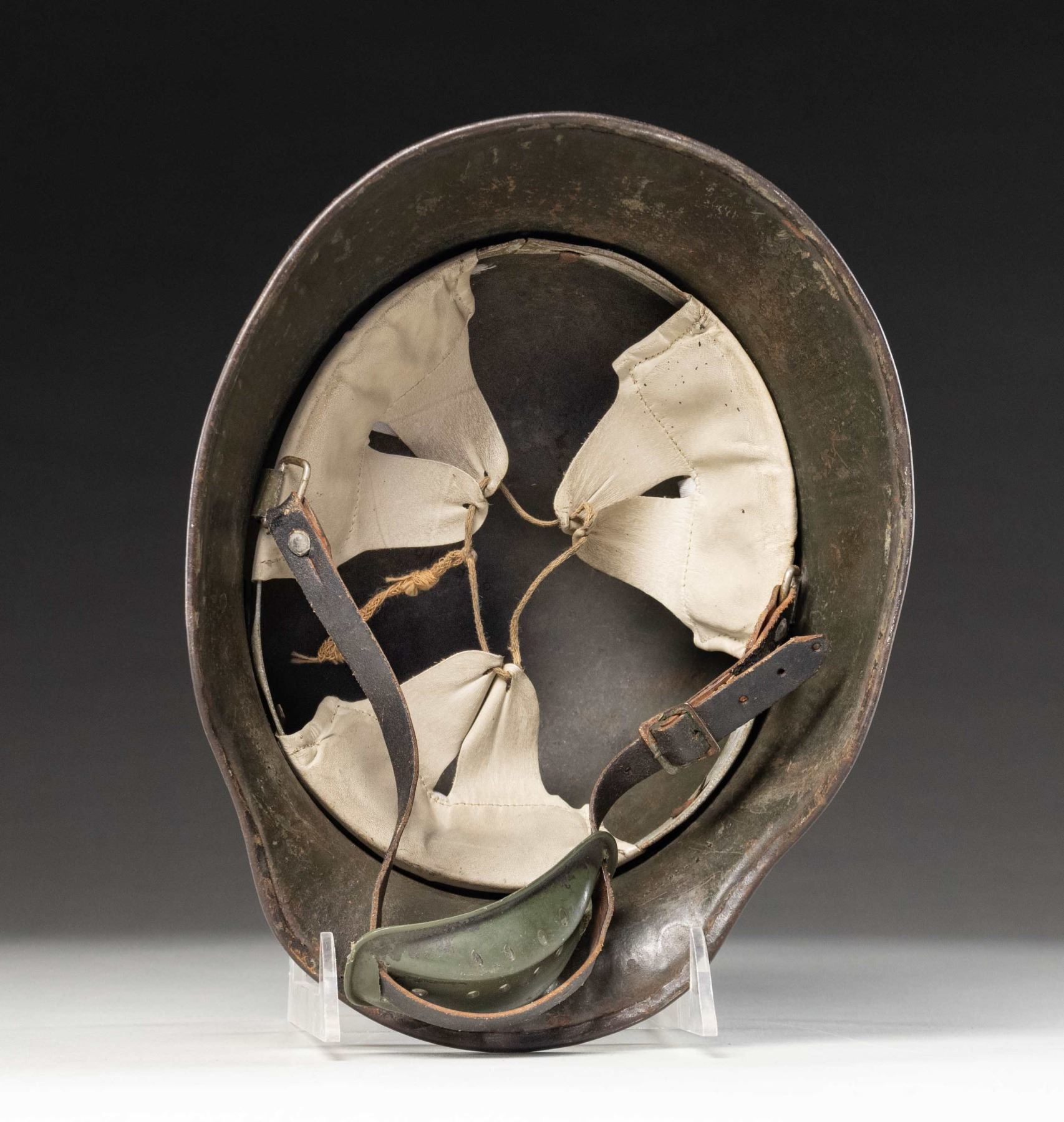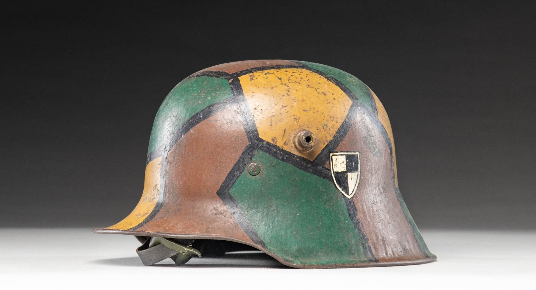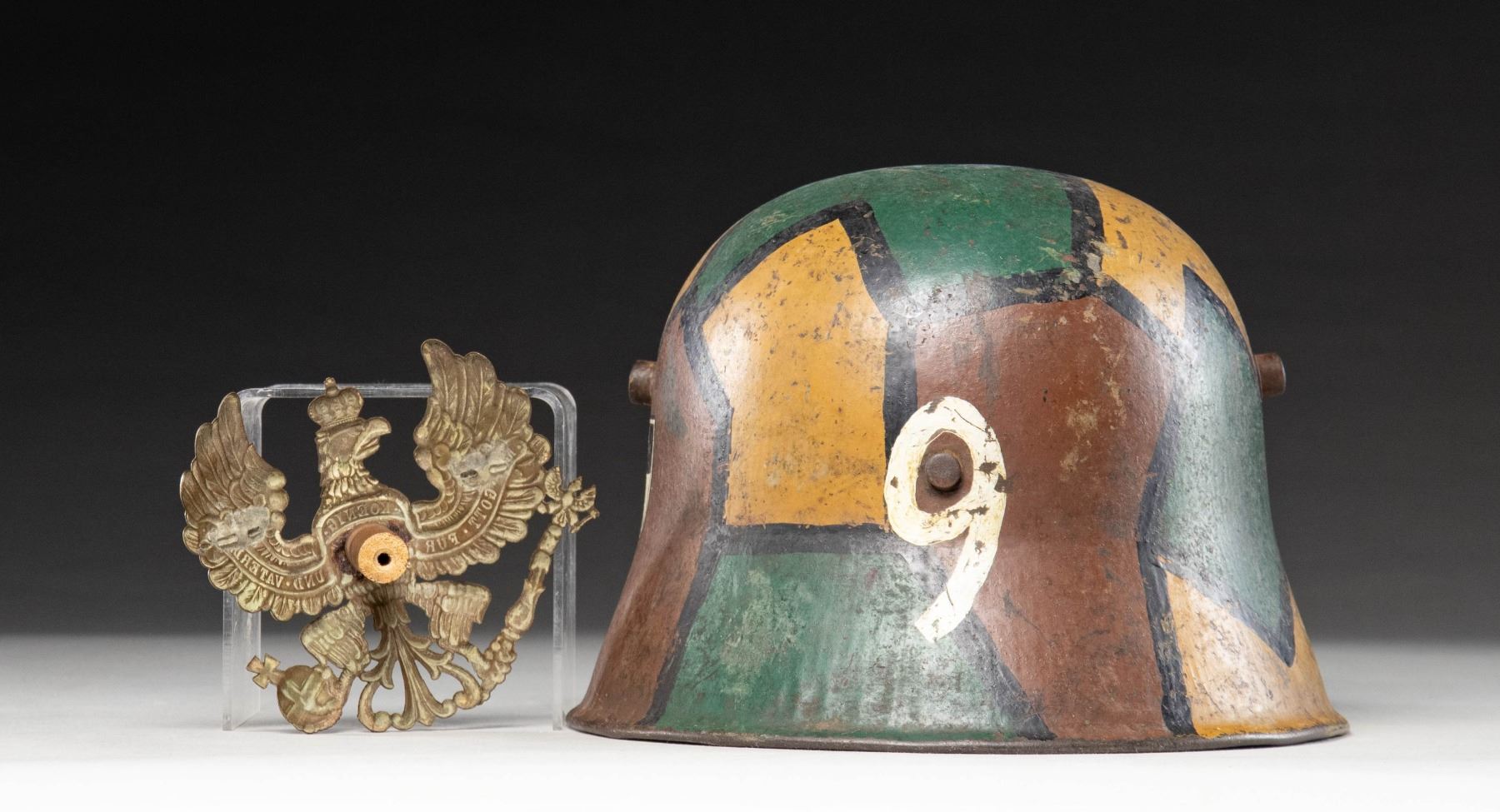 1) A model 1918 German steel helmet with a fine camouflage painted motif. Colors include green, brown, and mustard with black borders. Interestingly, this example has a neatly painted black and white Prussian shield on the left side. The inside left is stamped "B.F. 64", and there is a 3-pad white liner with a leather chinstrap and a plastic chin cup. CONDITION: painted finish is about 90% and the liner shows light wear. 2) Prussian brass front plate for a WWI era spike helmet. CONDITION: plate is complete but the attachment loops have been removed from the reverse and a small dowel has been glued to the back. (02-24221/BF). NON-GUN. $800-1,200.