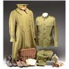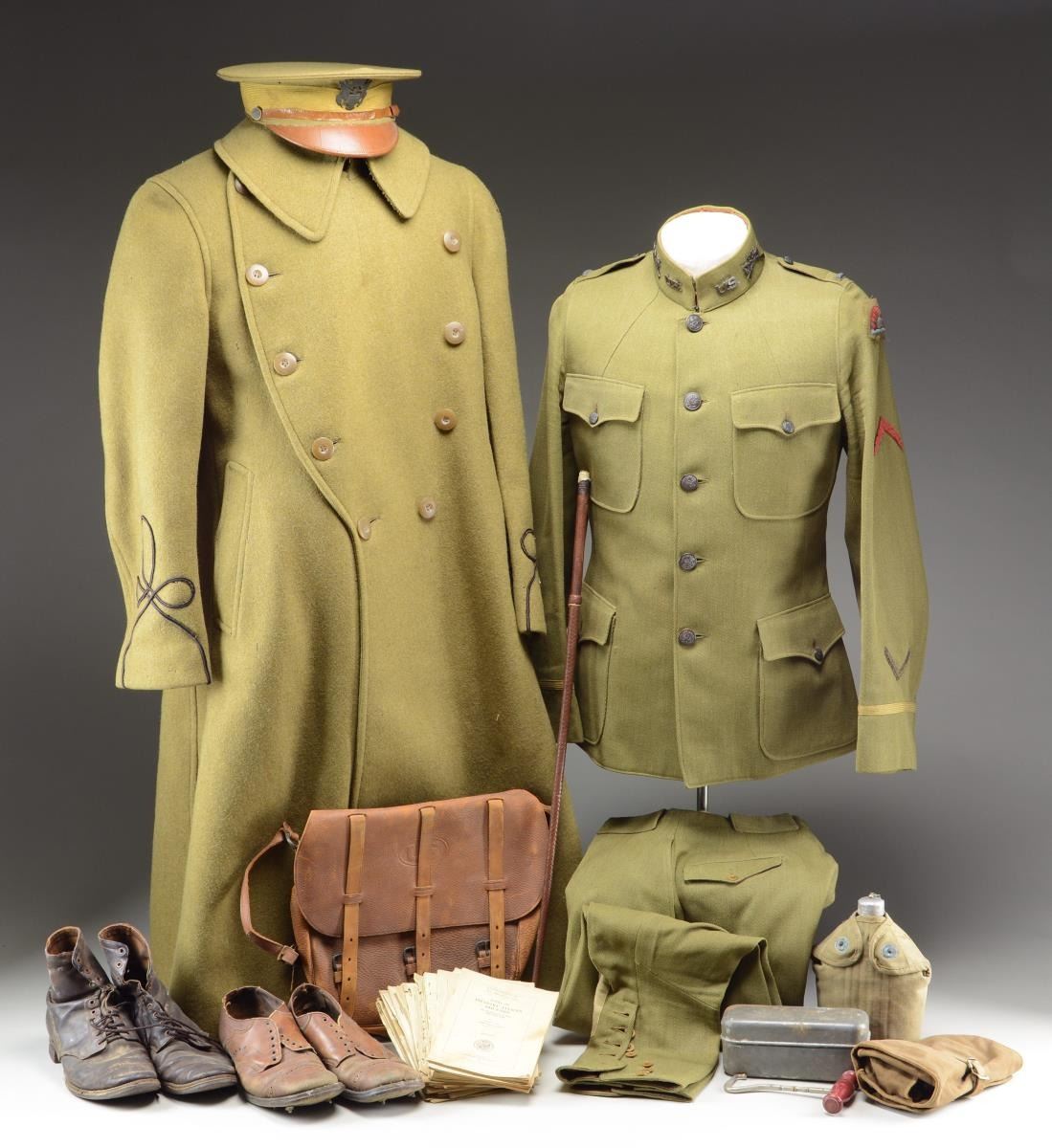MACGREGOR OF THE 302nd MACHINE GUN BATTALION. This wonderful group includes the hat, overcoat, uniform, & pants for Lieutenant MacGregor. The uniform has silver bullion Lieutenants bars on the shoulder straps, & the collar has “U.S.” insignia, along with crossed rifles flanked by an “M” & “G” with “302” above on each side. The left sleeve has a bullion 41st Division patch at the shoulder w/ a red chevron below. On the lower sleeve is a single bullion chevron. The Officer's overcoat is typical double-breasted, heavy, field green wool. The hat is a standard WWI Officer's cap w/ a subdued eagle at the front. This large lot also contains 4 pairs of period leather short boots or shoes, 3 pairs of high boots, both slip-on & lace-up, & one pair of leather puttees. Adding to the interest of the lot is MacGregor's swagger stick, a canteen w/ cover, an equipment pouch, military issue pamphlets on infantry & machine gun tactics, a toiletry kit, a meat can, a collapsible horse's feedbag, clip pouch, extra canteen cover, an M1904 dispatch pouch, 2 partial gas masks, a gas mask carrier, heavy canvas pants, a small backpack, a mess kit, M1904 spurs, leg wraps, a small lantern, a folding stove or lantern, a pistol belt w/ a russet leather 45 Cal. automatic holster, a boot pole, & a tin of saddle soap. CONDITION: the uniforms are in fine condition & display beautifully. The hat has a broken chinstrap & mildew on the sweatband. The boots & shoes are quite rough but generally complete. Other items show moderate wear but suffer from the effects of poor storage. (02-19933/BF). $500-800.