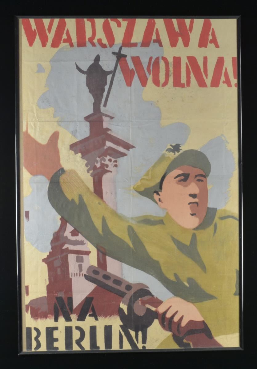 8) This WWII Polish poster measures approx. 36" x 24". The poster depicts a Polish soldier entering Berlin. The poster reads, “WARSZAWA WOLNA! NA BERLIN!”. CONDITION: items generally show very light wear & have been well preserved except as noted. PROVENANCE: Collection of Brian C. Pinkerton. (02-15453-2/BF). $400-600.