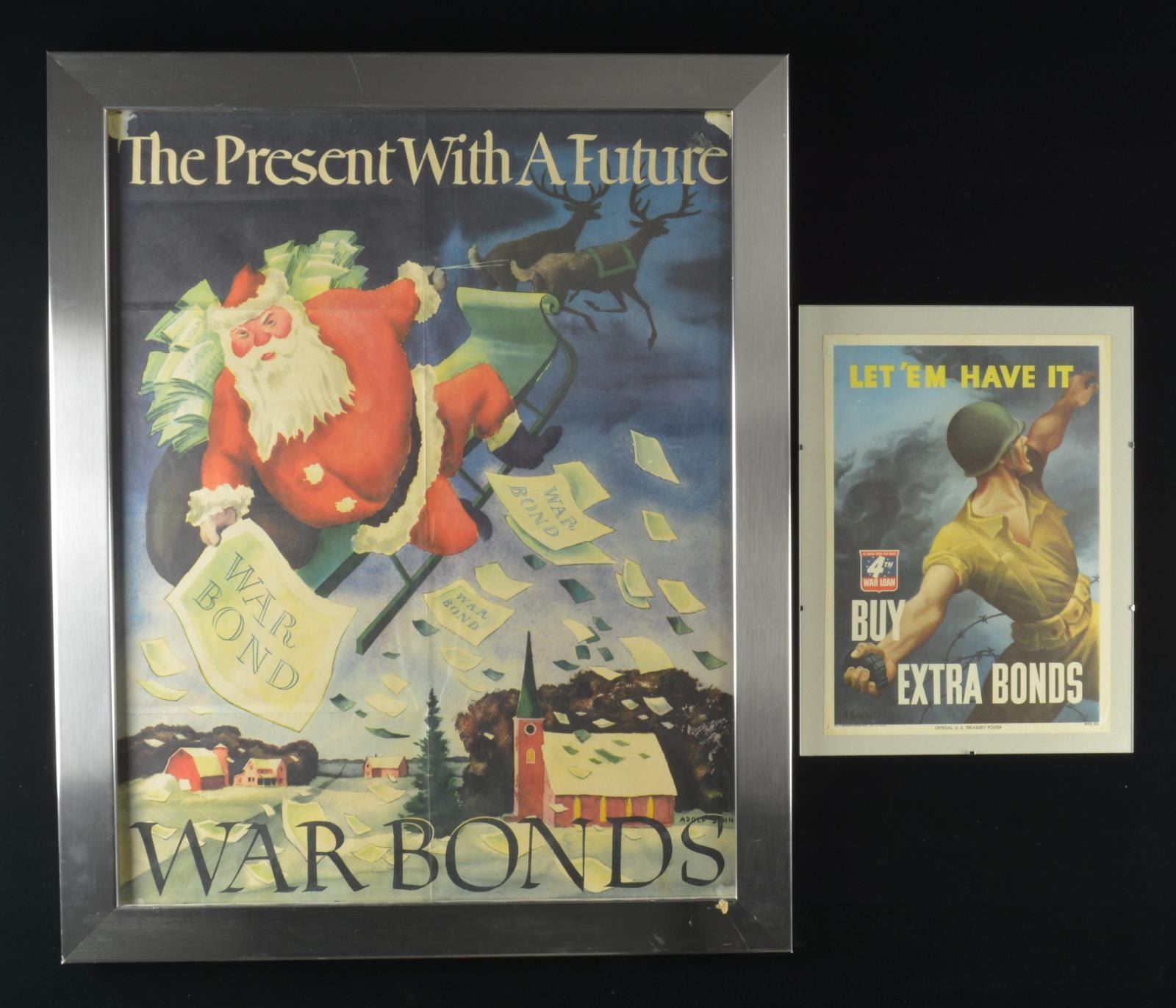3) This poster measures approx. 25 1/2" x 21 1/2". The poster depicts Santa Claus in a sleigh flying over a village tossing out War Bonds. The poster reads, “THE PRESENT WITH A FUTURE WAR BONDS”.