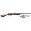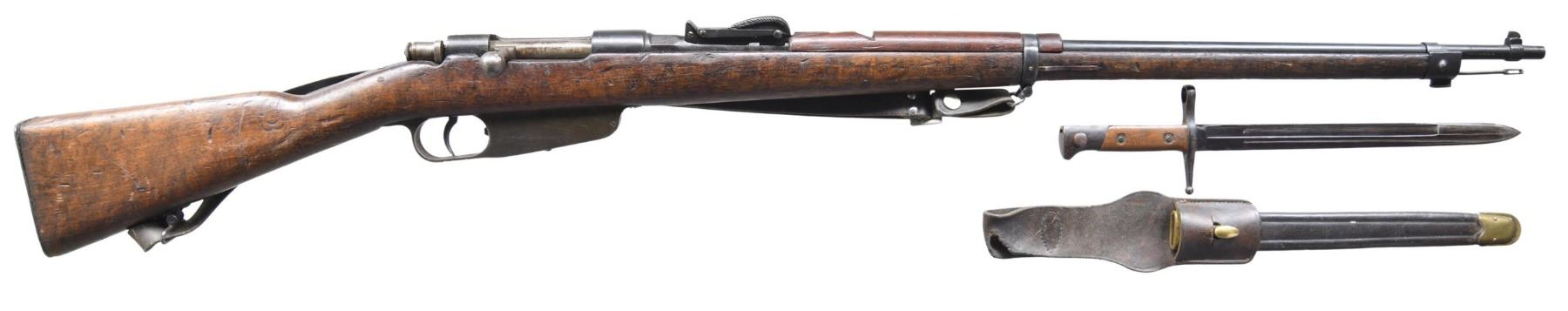 MILITARY RIFLE. Cal. 6.5 Carcano. S# B18391. Bbl. 30 3/4". Import-marked on the right side of the bbl. The bbl. is marked on the top over the chamber "TERNI" and marked on the top right flat "17." Tangent rear sight, graduated to 2000 meters. Blade front sight. Straight, bold handle. Cleaning rod and bayonet lug are present. Walnut buttstock with replacement hardwood handguard. Buttstock is marked on the left side with "ARTIG. FAB. D'ARMI TERNI (royal crown over shield) 22" in an oval above "RIPARAZIONE." Unmarked vintage military sling 7/8" in width. UNATTACHED ACCESSORIES: 11 3/4" fullered blade bayonet. Straight crossguard with ball finial; crossguard is marked on the right side "C. GNUITI-1942." Smooth walnut grips secured by two rivets. Black leather scabbard with brass throat and tip. Unmarked leather frog. Bayonet retains 50% of its original blue finish, with thinning and light wear. Grips have light wear and staining. Scabbard is fading to brown; stitching remains tight. Brown frog has notable wear and missing leather at the belt loop. CONDITION: stock set has extensive wear and handling marks with moderate staining. Markings remain largely visible. Metal has 60% of its original blue with thinning and wear. Bore is turning dark in the grooves, with worn lands. (24-6544/RW). CURIO. $300-500.