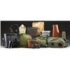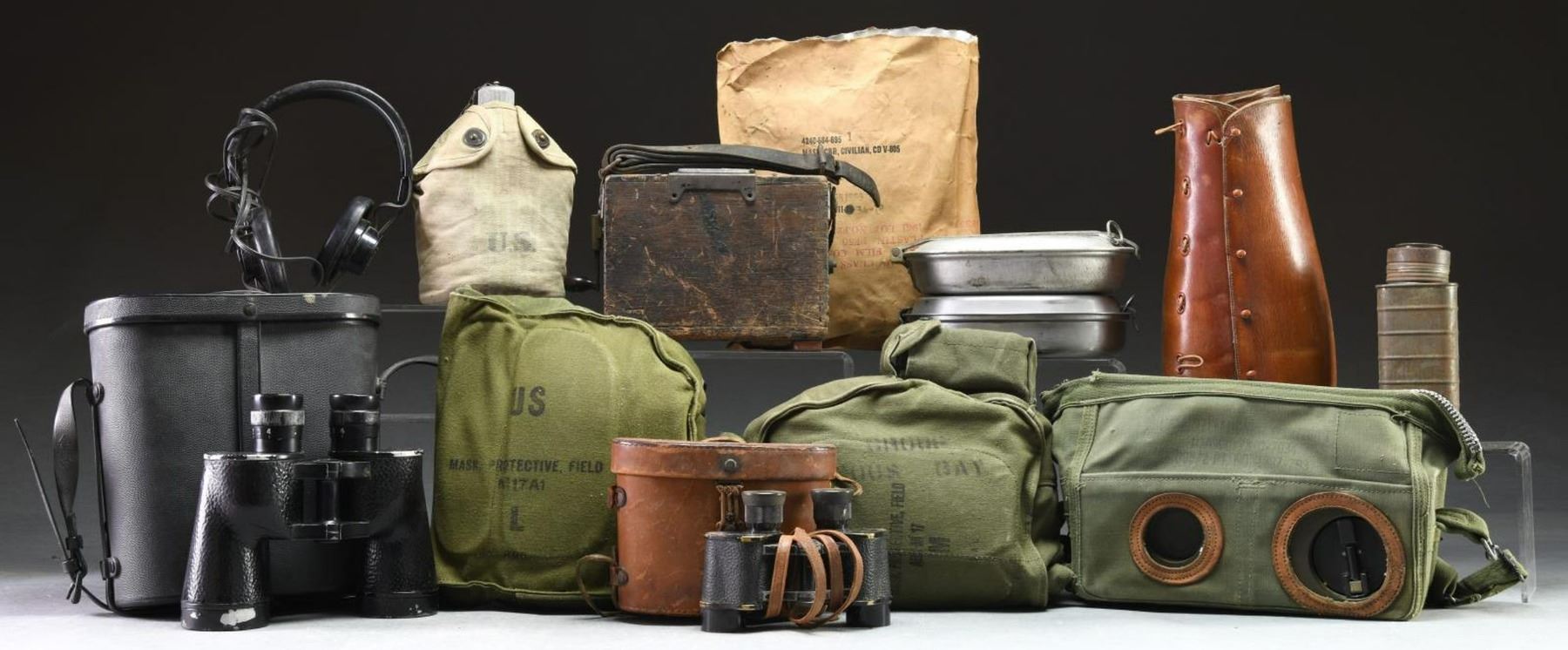 This lot includes 1 protective field mask M17 A1 in pouch. / 1 Protective field mask ABR-M 17 in pouch. / 1 WWII canteen with cover. / 1 Civilian CBR mask in pouch. / 1 Pair of Model A610 Telex earphones. / 1 Double ended tin container. / 1 Small OD pouch. / 1 Pair of cotton khaki canvas puttees. / 1 Pair of 7X50 binoculars in a rubberized case. / 1 Pair of Bauch & Lomb military stereo 6X30 binoculars in a brown leather case. / 1 WWI era ohm meter with crank generator. / 1 Unopened floatation bladder, 5-quart capacity. / 1 Pair of leather puttees. / 1 Push-to-talk field phone in OD carrying pouch. / 1 WWI mess kit. / 1 WWII mess kit with utensils. / 1 Pair of OD & leather slippers. / 1 Patient's effects bag. / 1 Small field pack with belt loops. / 1 OD anti-personnel mine carrying bag. / 1 Scabbard cover for an M1910 bolo knife. CONDITION: items generally show light to moderate wear. Ohm meter shows heavy wear & may not be functional. Binoculars need adjustment. (02-20938/BF). $300-500.