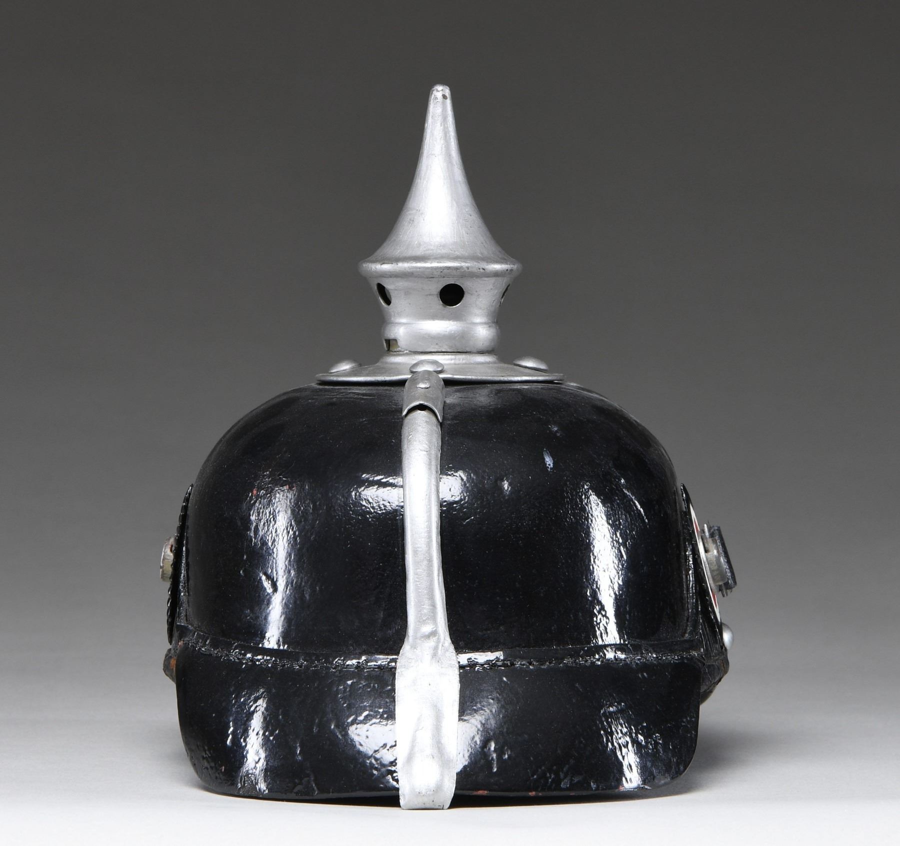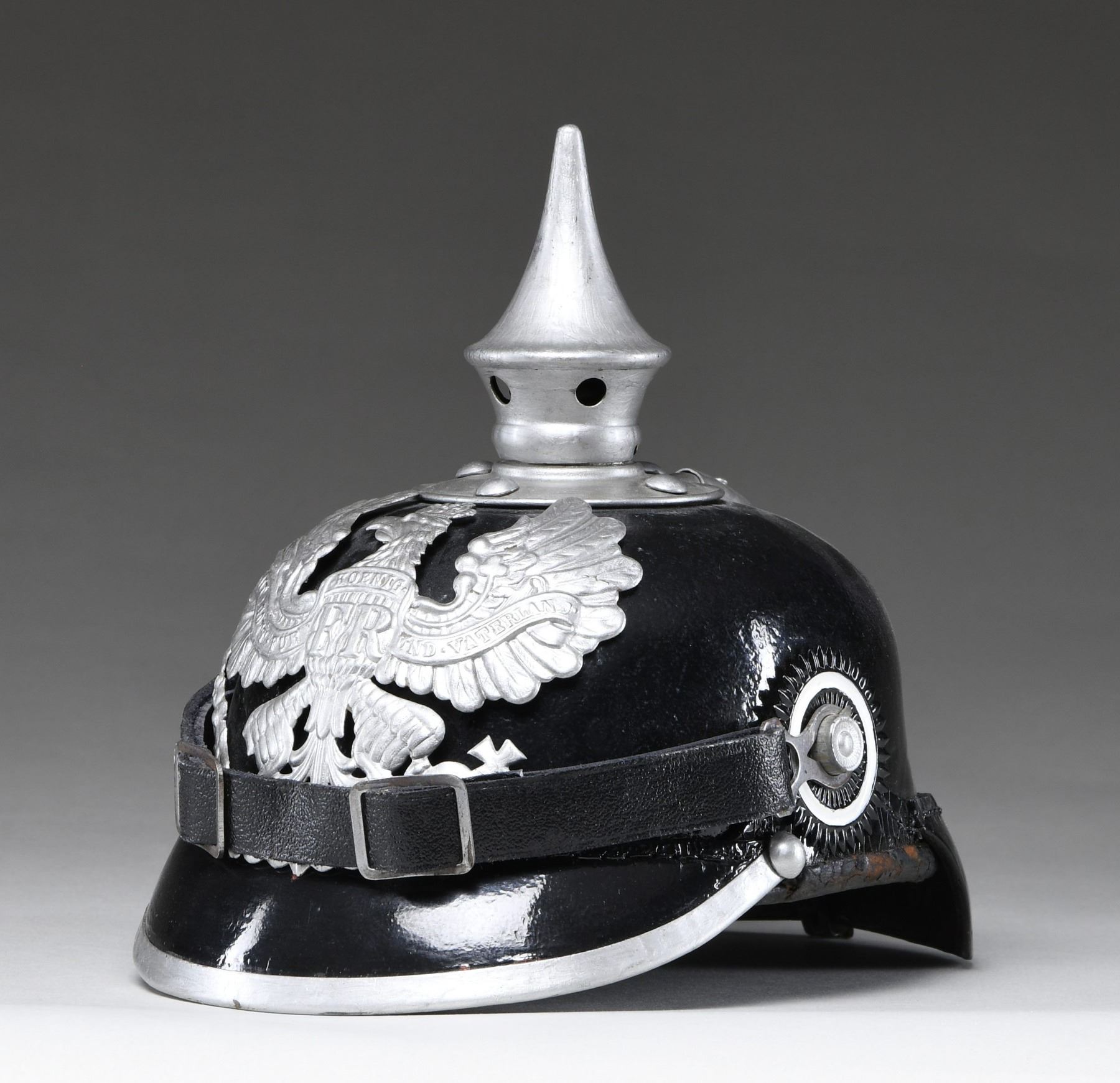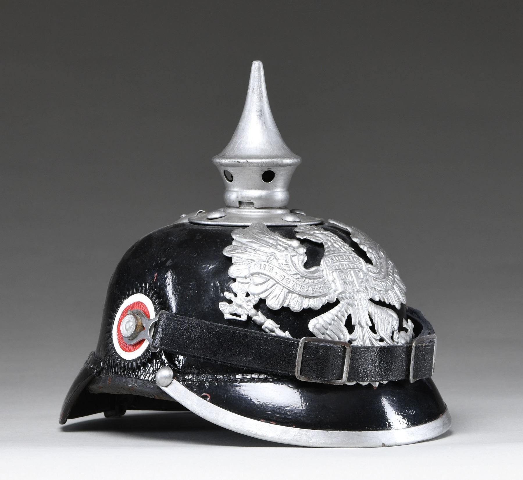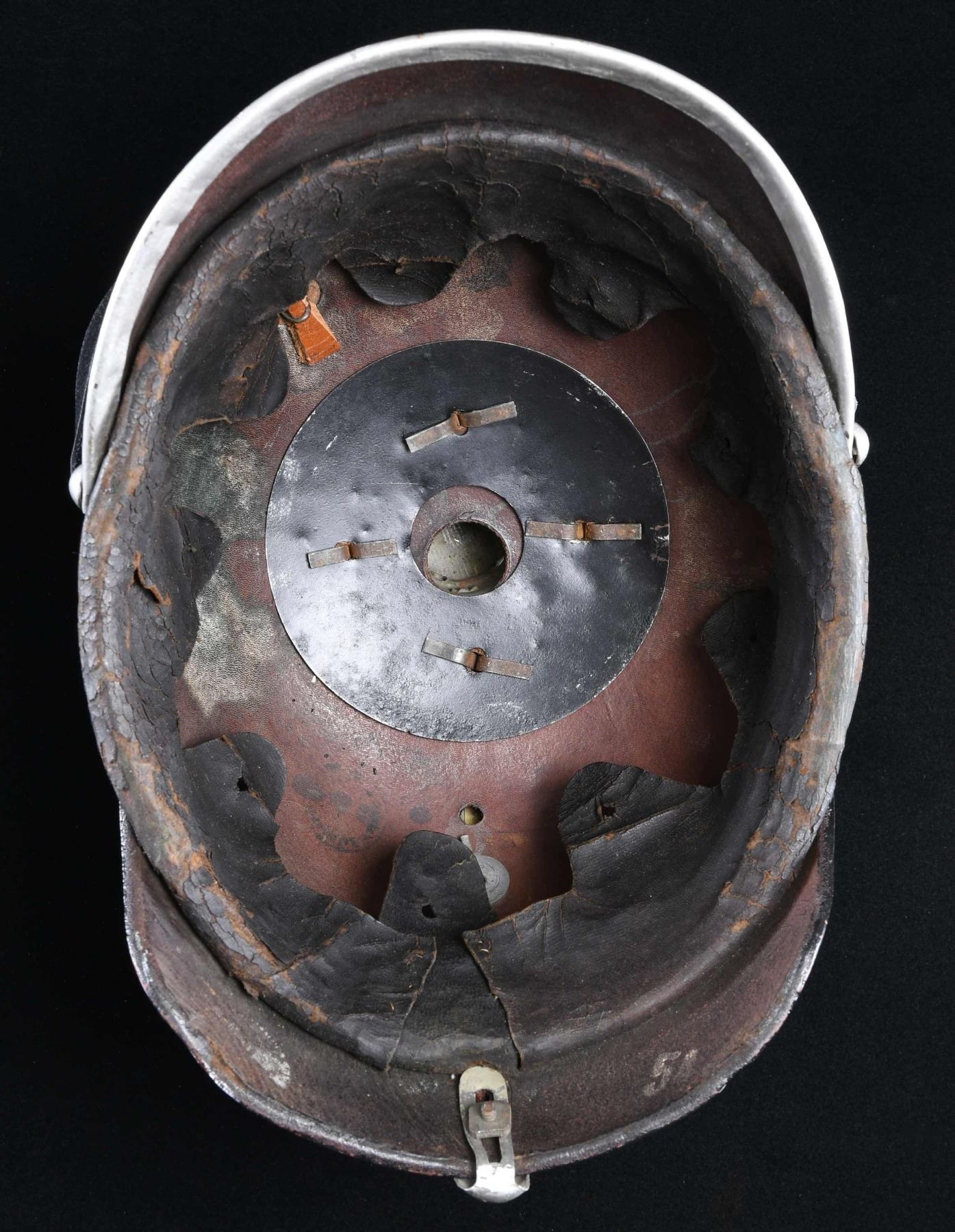 This WWI enlisted man's infantry spike helmet has a black leather body with a gray metal front plate, spike, base, spine, and visor trim. The chin strap appears to be a replacement and the kokarden are repainted. The interior shows a black leather 9-tongue liner. CONDITION: the helmet body has been painted black and the gray metal trim has been painted silver, likely by a well-meaning veteran. As stated, the kokarden have been repainted and the chin strap is believed to be a replacement. The interior is untouched and shows normal wear with no extra holes in the front of the helmet. (02-24027/BF). $250-450.