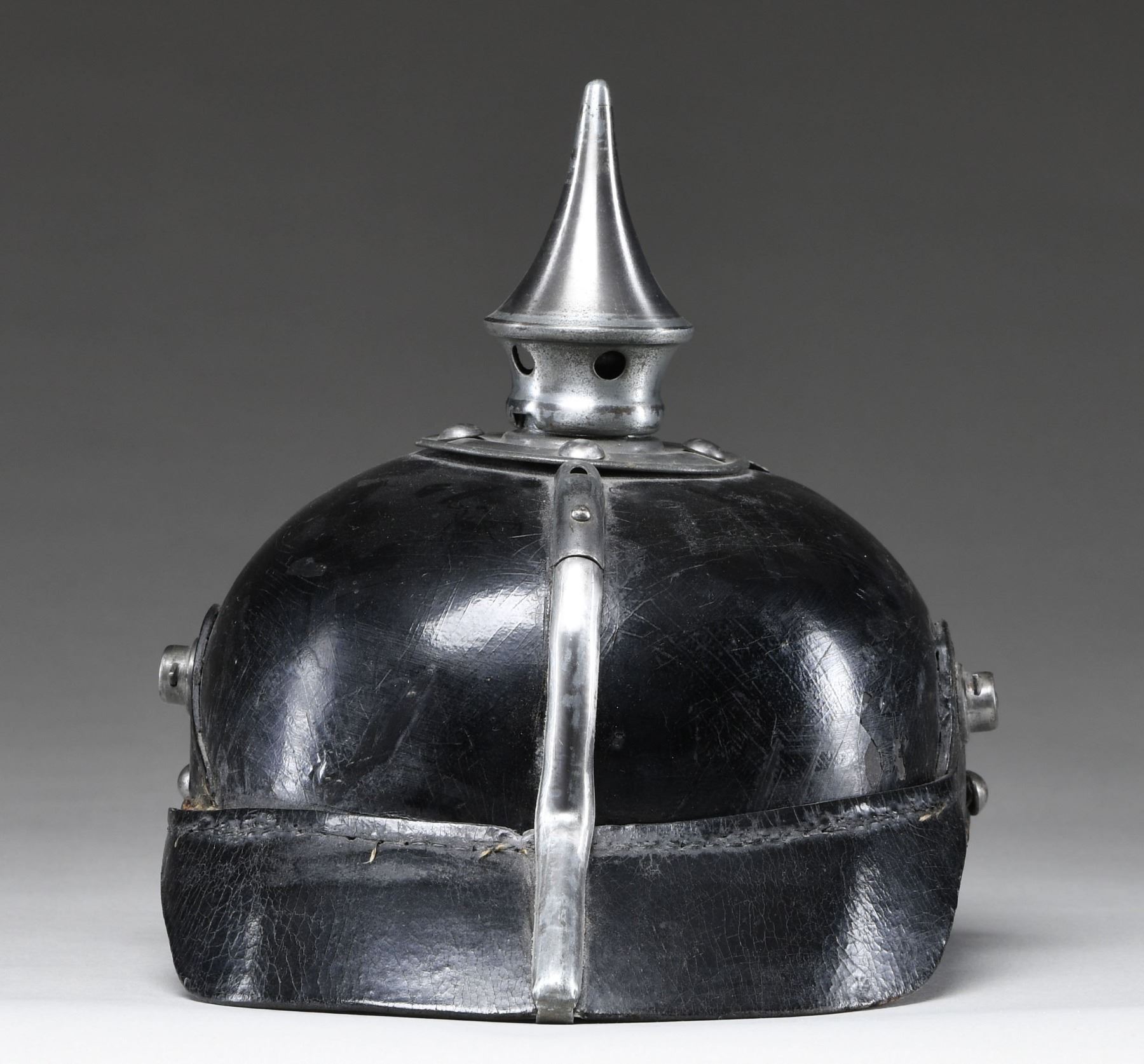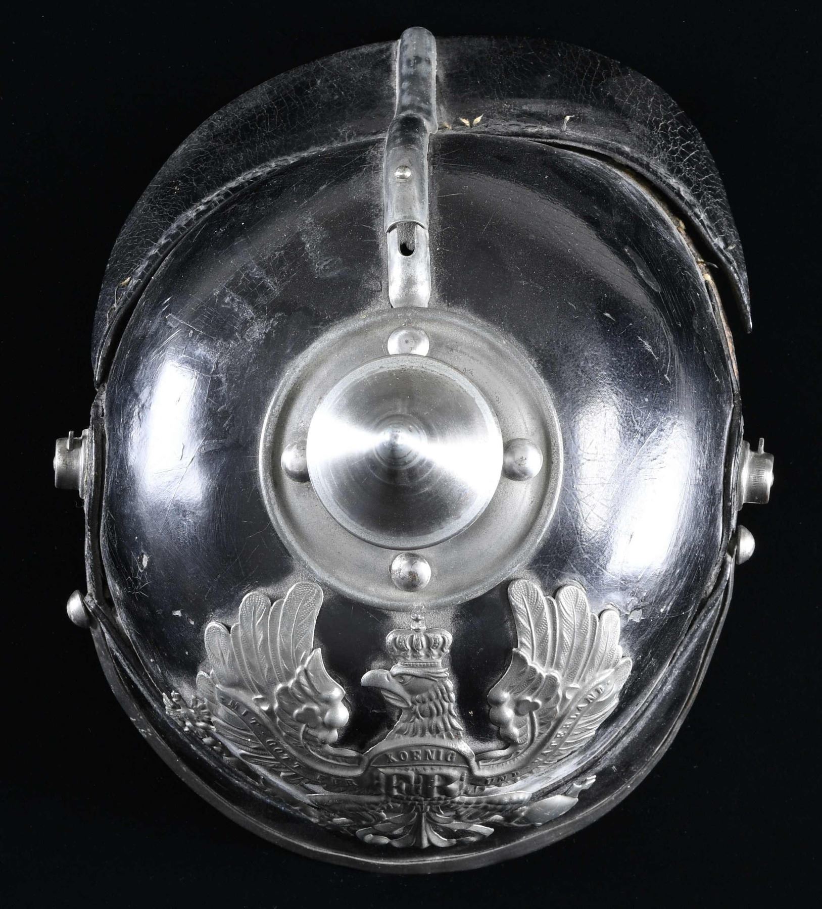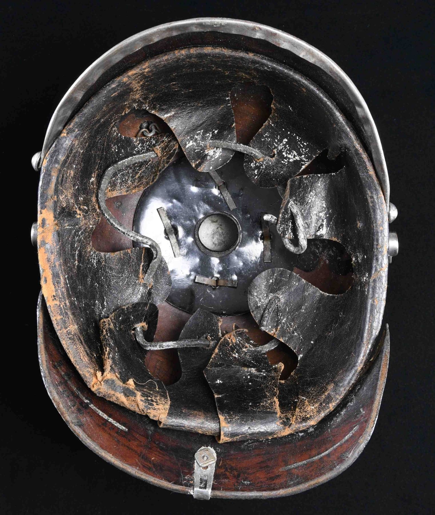 This WWI enlisted man's gray metal infantry spike helmet has a black leather body with a gray metal front plate, spike, base, spine, and visor trim. There is no chin strap or kokarden. The interior shows a black leather 9-tongue liner. CONDITION: the helmet generally shows light wear and displays well. The rear visor needs to be restitched. The liner is a bit tattered/worn and there are two extra holes in the front of the helmet that are unseen from the front. (02-24031/BF). $300-500.