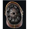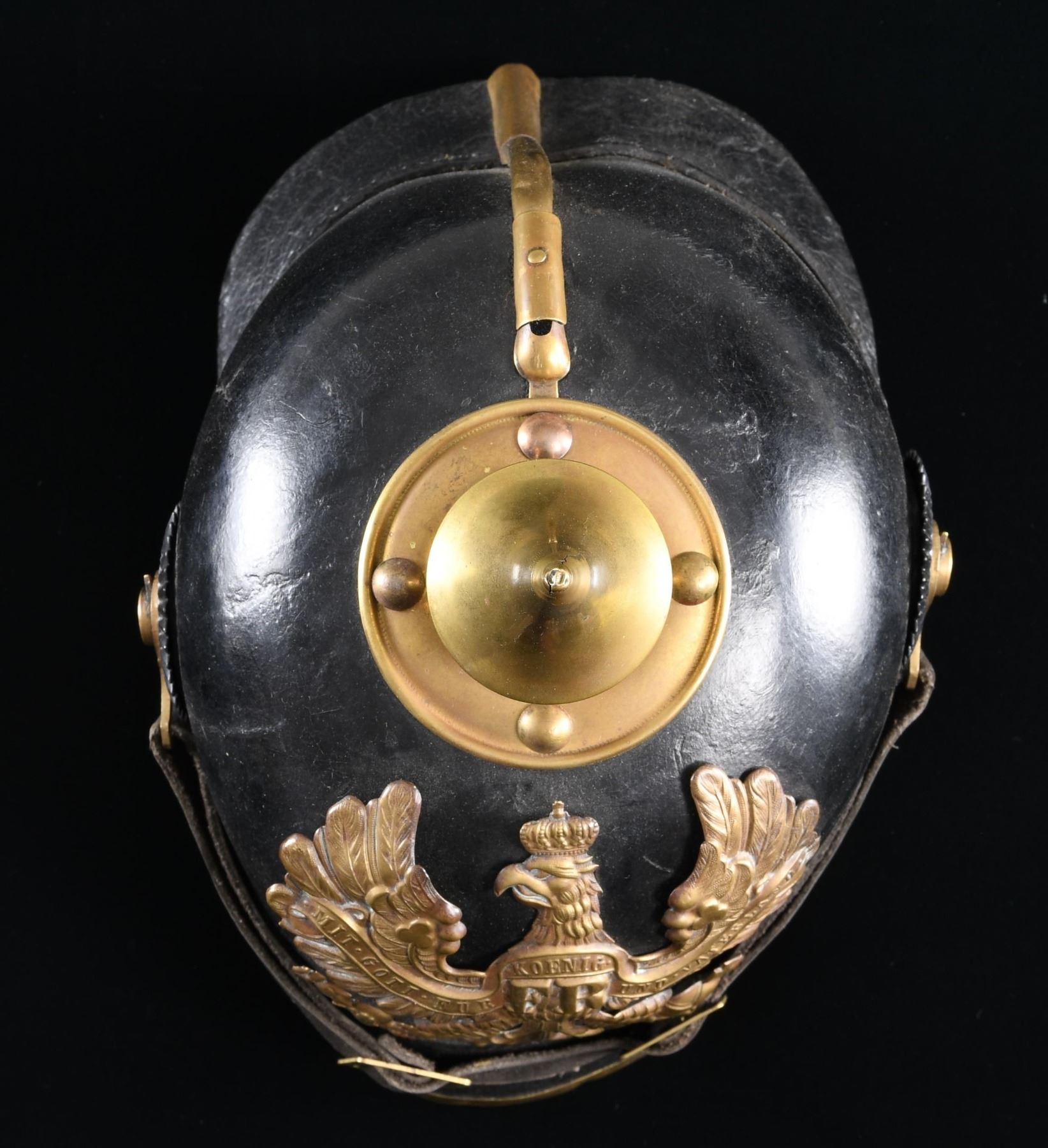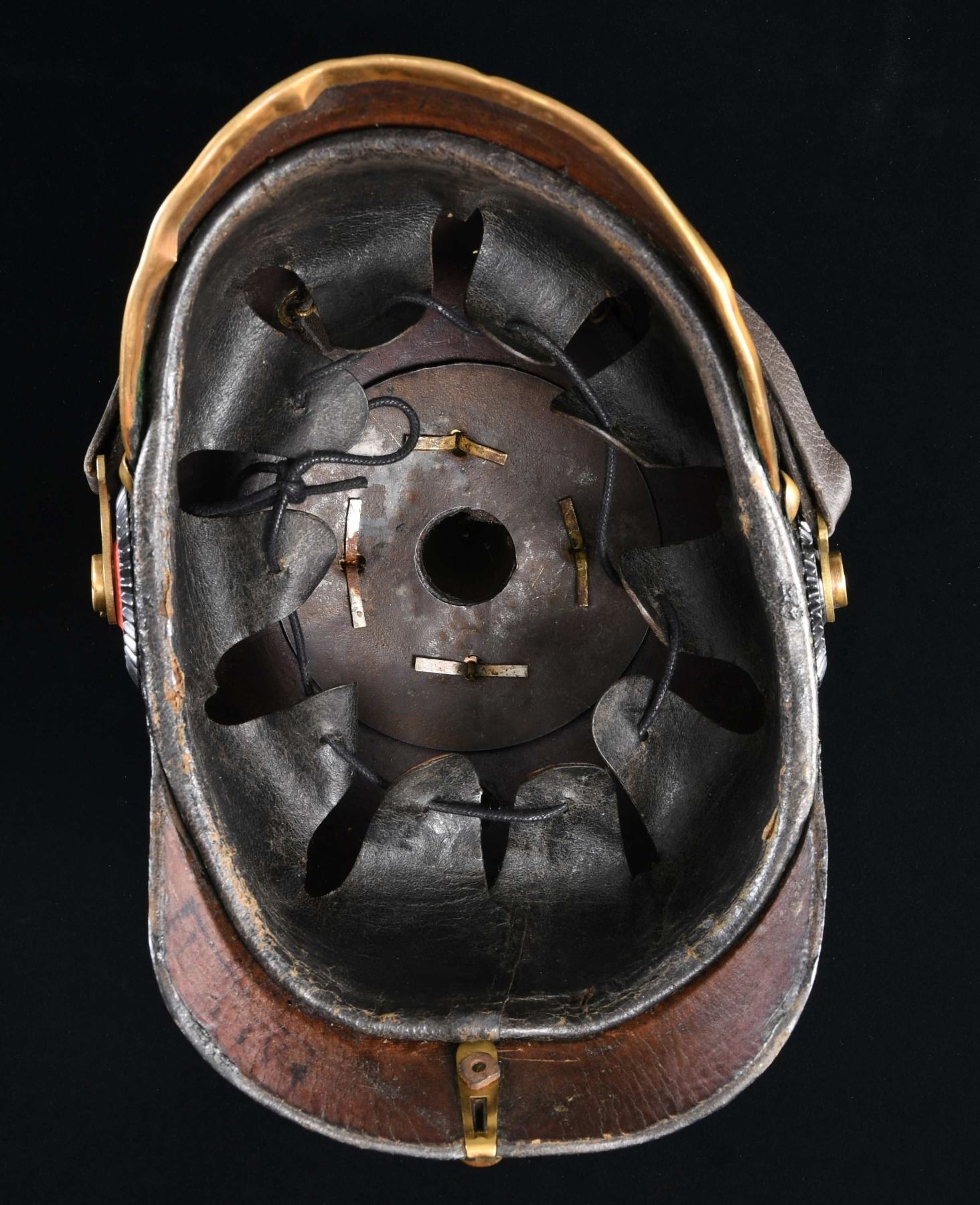 A nice example of a brass trimmed WWI German Infantry spike helmet. This helmet is all original with brass spike, base, front plate, visor trim, spine, side bosses and chinstrap buckles. Correct Prussian and National kokarden. Interior rear visor is stammped "B. n. IV". CONDITION: helmet show light general wear and has no extra holes in the front. (02-24500-3/BF). $300-450.