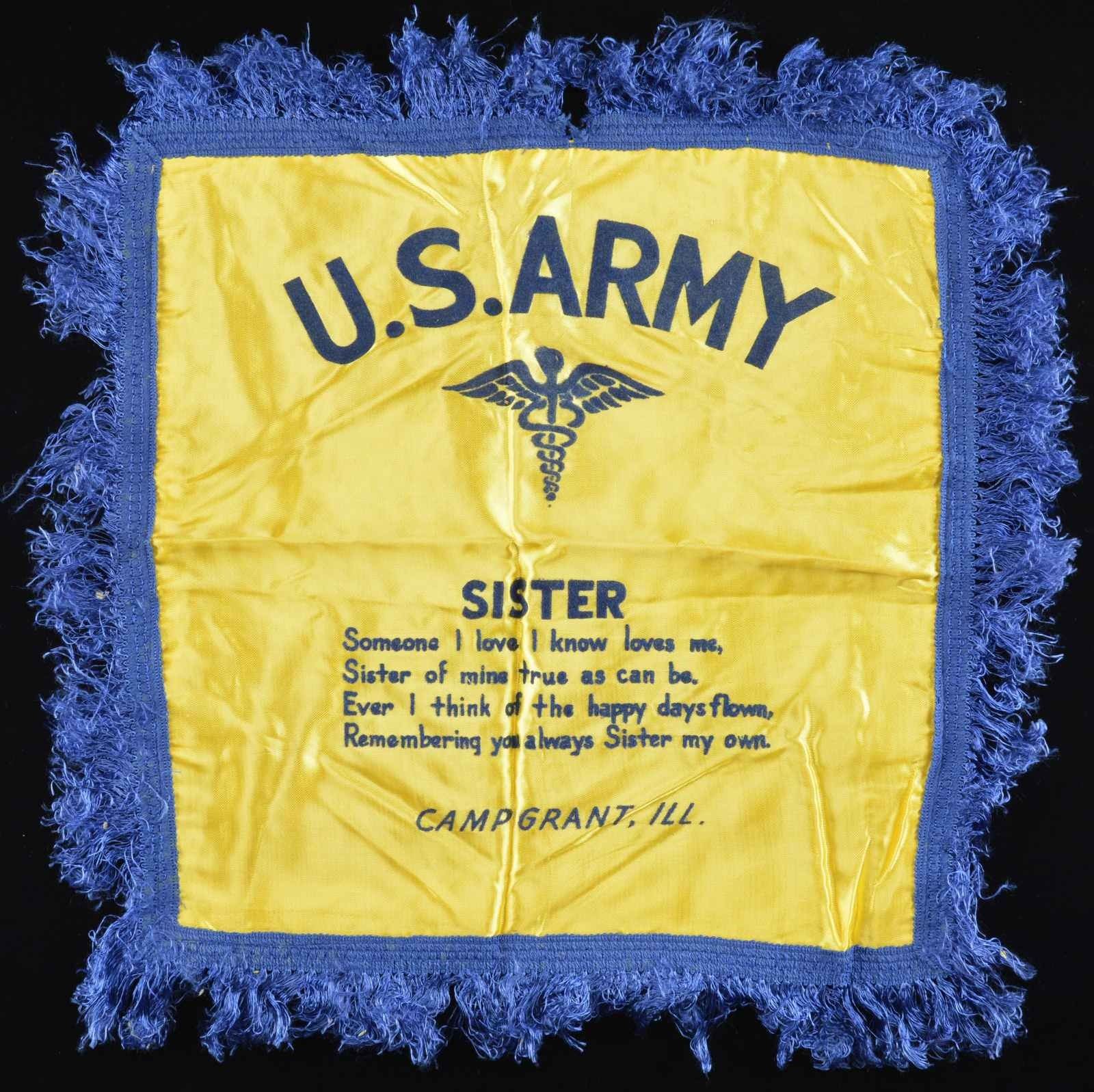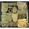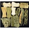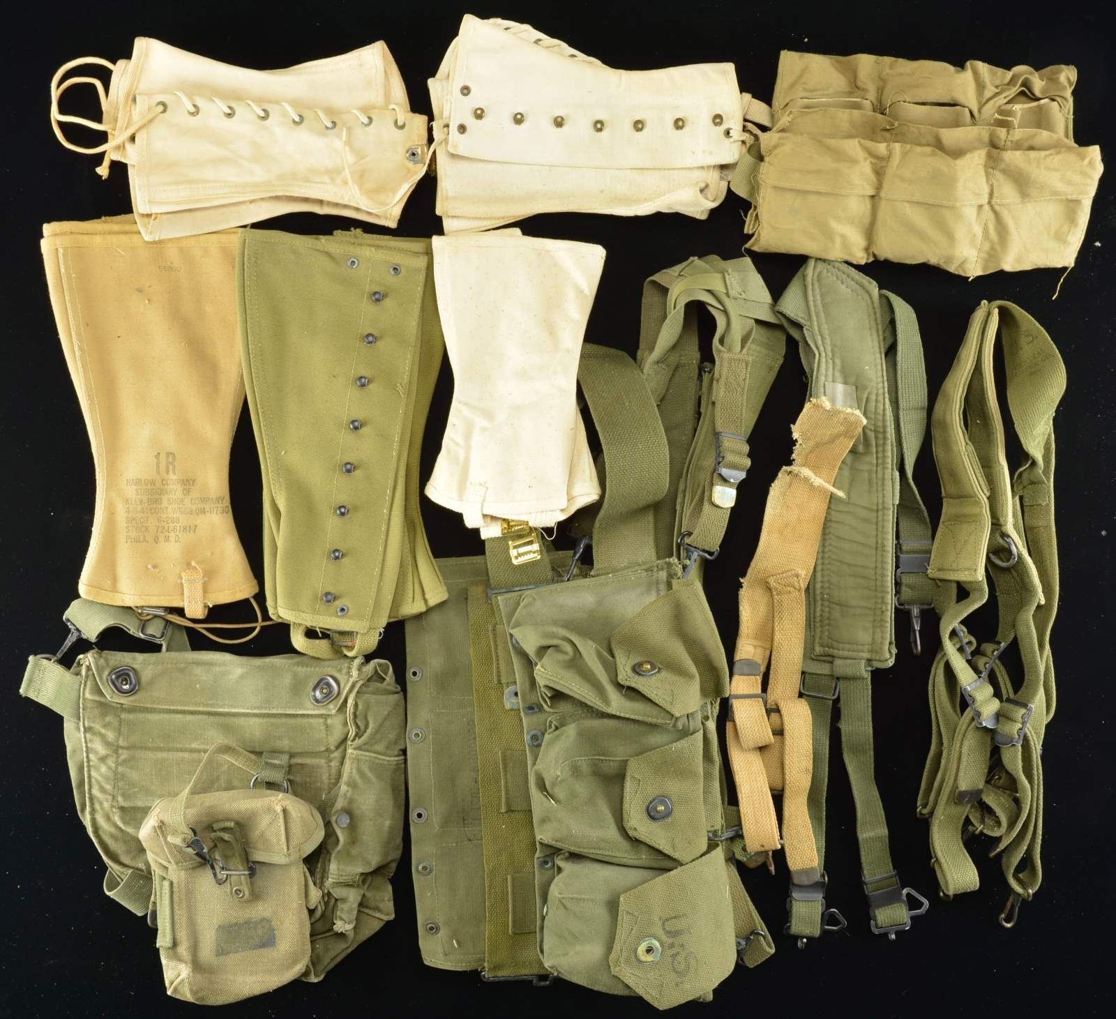 This large group contains 2 green canvas equipment belts with interlocking buckles. / 2 Green canvas over the shoulder equipment carriers. / 2 Green canvas slings. / 1 U.S. chemical-biological gas mask in green canvas pouch with carrying straps. / 1 Green canvas M65 carrying case. / 1 Green canvas U.S. gas mask pouch & attached equipment pouch. / 1 Very large green canvas 6-pocket BAR clip pouch with over the shoulder straps dated 1951. / 1 U.S. M9A1 green canvas gas mask pouch. / 2 U.S. M17 green canvas gas mask pouches. / 1 U.S. M17A1 green canvas gas mask pouch. / 2 Khaki cotton canteen covers marked “LUSTRE 1943”. / 1 Pair of green canvas puttees. / 1 Khaki canvas backpack marked “P.B.&C. 4-18”. Pack is complete with mess kit & stenciled “U.S.”. 1 shoulder strap is detached but present. / 5 White canvas puttees. / 1 Pair of khaki canvas puttees. / 1 Green canvas 3-pocket grenade pouch marked “BRESLEE MFG. CO. 1944”. / 2 Cotton canvas 6-pocket disposable cartridge bandoleers. / 1 Green canvas 3-pocket grenade pouch with a partially illegible mark that appears to read “MEYERS”. / 2 Unissued leather rifle slings. / 1 Aluminum canteen & cover dated 1945. / 1 Silk & fringe U.S. Army medical corps pillow cover. / 2 Green canvas clip pouches. / 2 Miscellaneous green canvas pouches. CONDITION: all items show light to moderate wear and appear complete as issued. (02-16855/BF). $400-700.