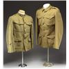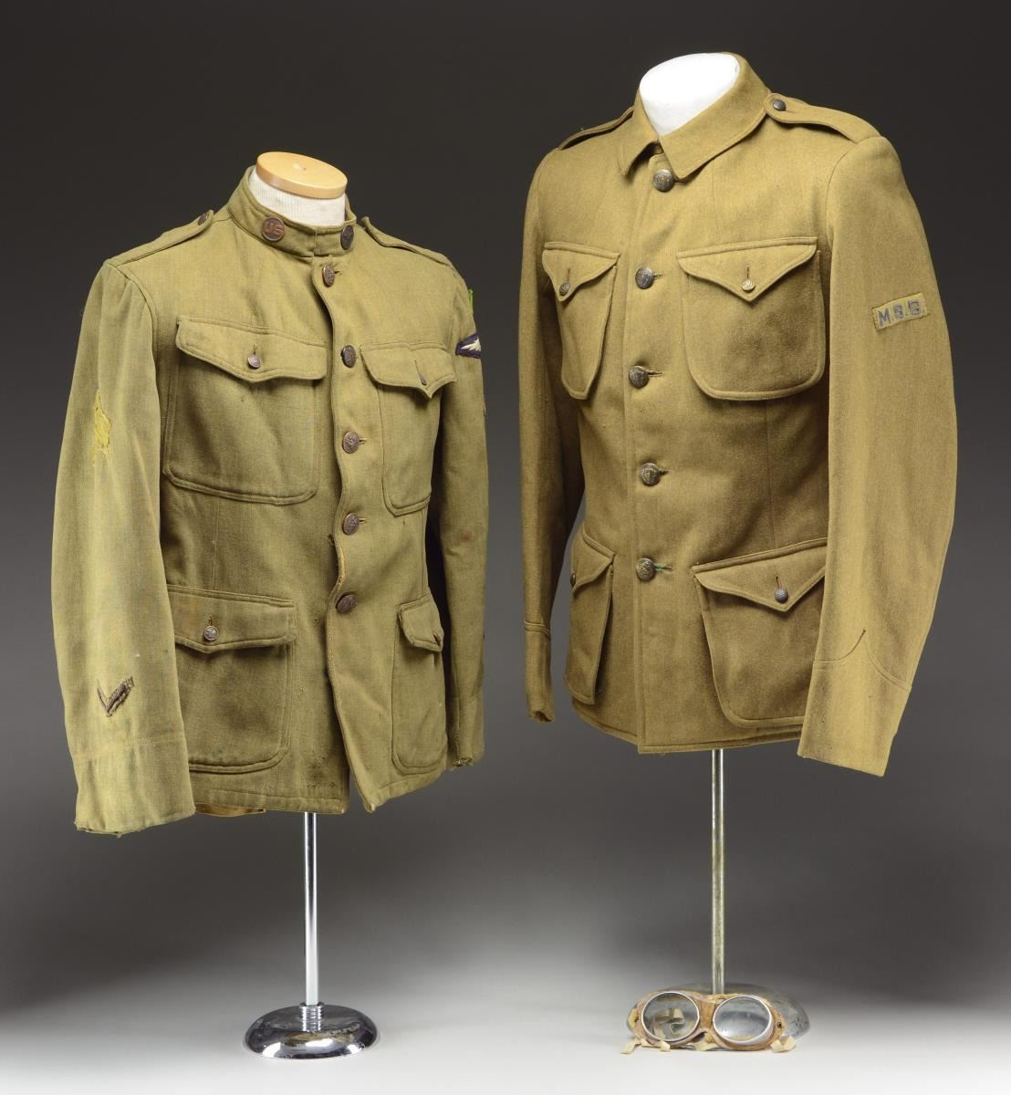 1) A wonderful WWI enlisted tunic for a Sergeant of the Air Corps. The collar has correct “US” and Air Corps collar discs. At the left shoulder is a green diamond above a set of enlisted Pilot wings above a red single chevron. The bottom of the right sleeve has a single bullion chevron, and the bottom of the left sleeve has two bullion chevrons. An exceptionally rare WWI enlisted Pilot uniform. CONDITION: uniform shows expected wear with a small threadbare area on the lower front. 2) A WWI Massachusetts State Guard tunic. Uniform has 5 subdued Massachusetts state seal buttons down the front. The left sleeve has a sewn patch that reads “M.S.G.”. CONDITION: uniform shows very light moth damage. 3) A pair of goggles of a type generally used by Pilots. Goggles have 2 aluminum sided eye pieces with a fur & leather outer edge. CONDITION: light wear overall. (02-20943/BF). $400-700.