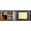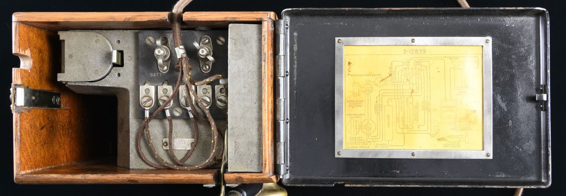 This WWI US Army camp telephone measures approximately 9 3/4" by 5" by 7 1/2". The internal components are housed in a dovetailed oak box with an iron top and bottom. The interior of the top lid has paper connection instructions within a metal frame. The exterior of the lid has a brass plaque that reads "CAMP TELEPHONE MODEL A SIGNAL CORPS U S ARMY ORDER NO 8936 JULY 21 1917". A brass, painted aluminum and composite handset hangs off the front of the case. A braided cord connects the handset to the interior. CONDITION: the telephone appears to show light wear throughout. The hand crank on the side functions well and the entire apparatus seems to work but has not been tested with another machine. (02-24288/BF). NON-GUN. $200-400.