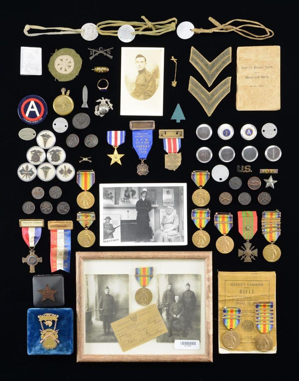 MATERIALS. This interesting lot consists of 8 WWI Victory Medals, many of which have bars. / 1 WWI Victory Medal with a Defense Sector bar belonging to Jacob Sharpe with associated photos. / 1 Trench lighter. / 1 Post-WWI Silver Star. / 1 Croix de Guerre. / 3 Veterans Medals. / 1 Veteran's Delegate Ribbon. / 15 Collar discs of various organizations & branches. / 7 Dog tags. / 2 Dog tag-like discs that read “MEAL CHECK”. / 1 French dog tag. / 1 Medal that reads “EGBERS TROPHY 1924 WON BY FLOYD L. SMITH”. / 1 Subdued Star engraved on the reverse “Pvt. George F. Henwood Springfield I.A.T.C. Oct. 3, 1918”. The star reads on the front “HE GAVE HIS ALL”. George Henwood enlisted in the Army on September 1, 1918 and died October 3, 1918 of influenza-pneumonia. / 8 Pieces of Officers collar insignia. / 1 Pinback pine tree. / 1 WWI piece of hard tack from Camp Lewis. / 1 Aluminum match safe dated “1917 FRANCE 1919”. / 2 Large WWI Marine Corps buttons. / 1 Enlisted hat eagle. / 1 Gold plated 6th Division ring. / 1 Pinback 3rd Army pin with pin missing. / 2 Cloth Corporal chevrons. / 1 Lapel pin of the 3rd Army. / 1 Lapel pin of the 77th Division. / 2 Pieces of trench art made from 45 Cal. bullets. / 1 Driver's patch. / 1 Catholic prayer book. / 1 Marine EGA insignia. / 1 WWI Victory Medal ribbon bar with 5 stars. / 1 Star insignia. / 1 Lazy dog bomb. / 1 Soldier's Handbook for the M1917 Rifle. / 2 Sweetheart pins. / 1 Postcard photo of an American doughboy. CONDITION: condition varies, but most pieces show light wear with most of their original finish intact. Medals all have their original ribbons. PROVENANCE: From the Lifelong Collection of Glen E. Mattox. (02-18901/BF). $400-600.