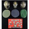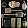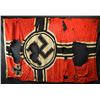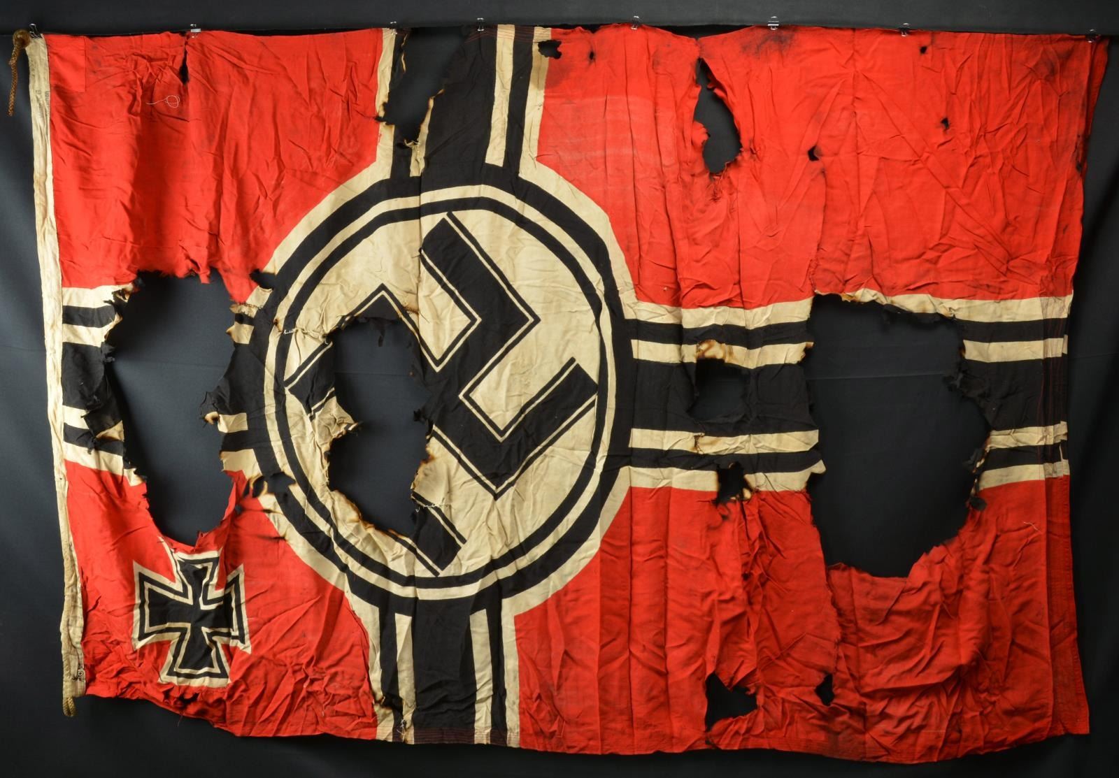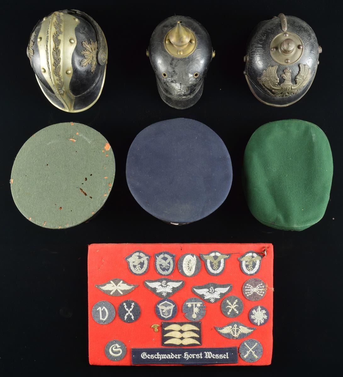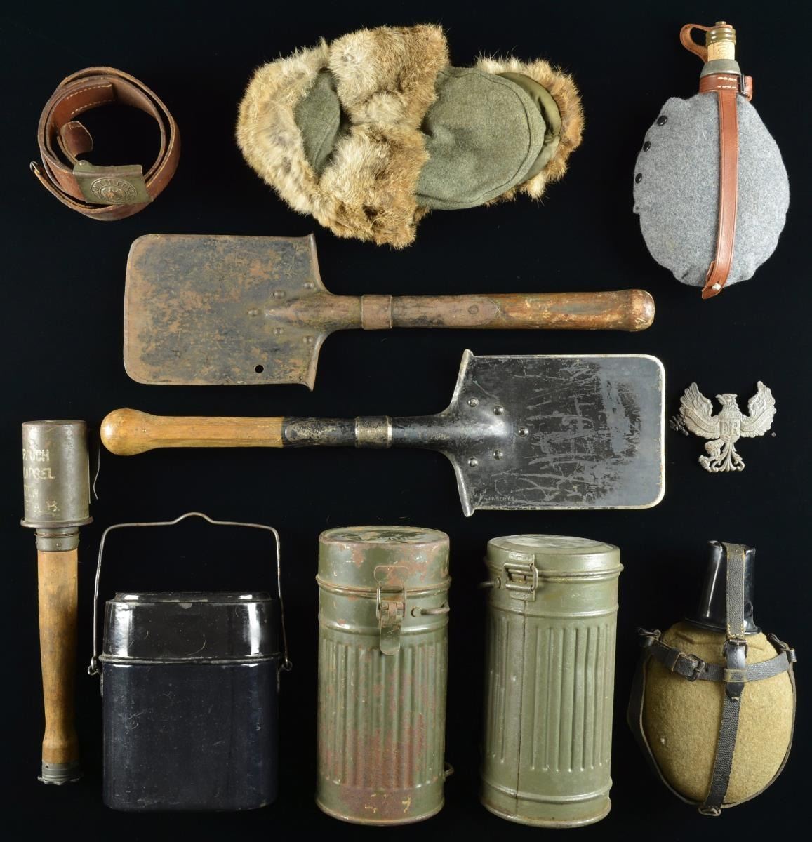 This varied group consists of a WWI period officers fire helmet with substantial embellishments. / 1 WWII style Luftwaffe officers visor cap with a broken pin on the eagle. Hat may be of post WWII production. / 1 WWII gas mask in canister. / 1 WWII gas mask canister. / 1 Black enamel mess kit. / 1 WWII Wehrmacht belt & buckle. / 1 WWII Canteen with bakelite cup. / 1 WWII Canteen with replaced cover & cork. / 1 Frame containing 14 WWII Luftwaffe specialty patches, 4 cloth award badges of possible post WWII production, 1 cuff title that reads “Geschwader Horst Wessel”, 1 triple gull patch, 1 NSKK pin, and 1 blue enamel party symbol hat pin. / 1 WWII police type visor cap with a green crown and black band. / 1 WWII rabbit fur winter hat. / 1 WWI Prussian spike helmet with gray trim, missing the spike, kokarden & chin strap. / 1 WWI spike helmet with brass trim, missing kokarden, chin strap & front plate. / 1 WWII Dewat stick hand grenade. / 2 Entrenching shovels. / 1 WWII Army visor cap with navy blue piping in poor condition. / 1 Partial WWI Prussian gray metal spike helmet front plate. / 1 Large Kriegsmarine battle flag in relic condition missing substantial sections of the flag. CONDITION: generally items show moderate to heavy wear, except as noted. (02-16490-3/BF). $700-1,000.