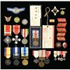 MATERIAL. This interesting group of mostly WWII Japanese militaria includes 1 medal bar consisting of an Order of the Rising Sun 8th Class, China Incident Medal, and Red Cross Medal. / 1 Russo Japanese War Medal. / 1 First World War 1914-20 Medal. / 1 China Incident 1937-45 Medal. / 1 Showa Enthronement Commemorative Medal. / 1 Red Cross Golden Merit Award. / 1 Manchukuo Occupation National Foundation Merit Medal. / 1 Manchukuo Occupation Order of the Pillars of State 4th Class. / 1 Wounded in Battle Badge. / 1 Reserve Officer Rank Badge. / 1 Aviation Proficiency Badge 2nd Class. / 1 Soldier Relief Association 3-Legged Crow Badge. / 1 Navy Merit Badge. / 1 Bar of 4 miniature medals. / 2 Pair & a single collar tab. / 1 Pair of bullion aviator wings. / 1 Paper wound tag. / 1 Silver carrying case for coins. / 2 Unidentified pins. CONDITION: all items show light wear and appear to have no damage to the enamel. All medals have their correct ribbons and show little wear. Badges are complete with pins. PROVENANCE: From the Lifelong Collection of Glen E. Mattox. (02-18442-5/BF). $800-1,200.