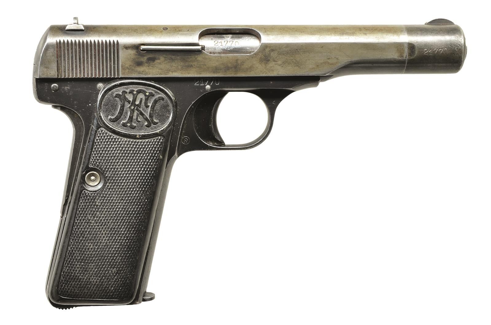 Cal. 7.65mm (32 ACP). S# 21770. After Belgium capitulated in May 1940, FN began producing 1922 pistols for Germany. S# indicates mfg. Nov. - Dec. 1940 (S# range 20,000-25,000) w/ eagle "WaA613" & acceptance proofs. This blued pistol has 4 1/2" bbl., fixed sights, flanged trigger & 2 piece hard rubber grips w/ FN monogram. Matching numbered bbl., bbl. lug, slide (underside) & frame. MAGS: 1-9 rd. CONDITION: very good frame blue w/ spots of peppery oxidation, pinprick oxidation throughout & minor handling marks. Slide & bbl. lug faded to gray/brown having areas of blue on sides & bottom, along w/ handling marks, patina & peppery oxidation. Inside ejection port has reddish coat, possible storage residue. Good plus grips w/ minor handling marks. Very good bore w/ light frosting & sharp rifling. (22-90/MD). CURIO. $400-600.