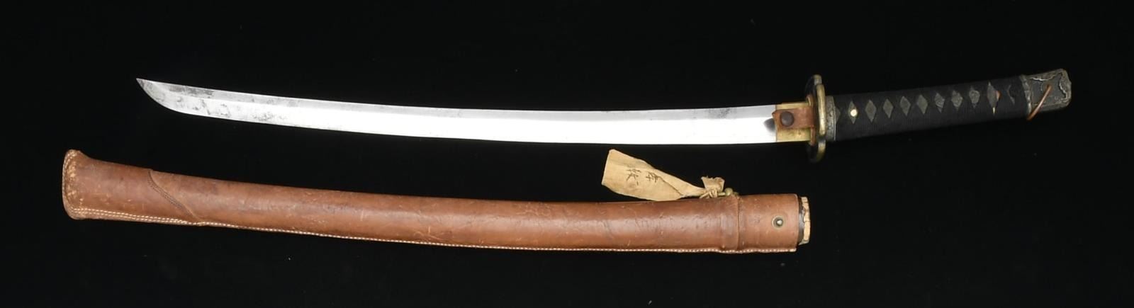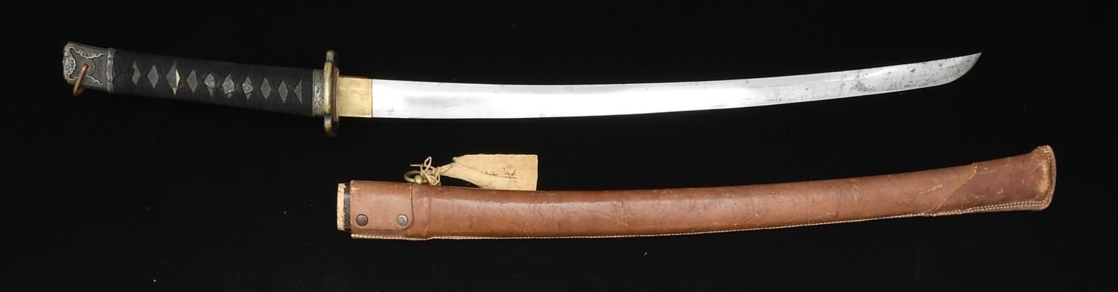 Overall length: 34 1/2". Blade length: 22 7/8". This sword features an early blade w/ an irregular hamon. The brass habaki has traces of silver plating. The nakago has a single mekugi-ana. The blade is unsigned but is very well made. The tsuba is heavy brass w/ silver plates above & below decorated in a foliate motif. There is 1 seppa below & 1 above the tsuba. The tsuka has matching fuchi, menuki & kabuto-gane that in turn match the silver plates above & below the tsuba. The tsuka-ito is black over what appears to be black same. The saya has a military style leather cover over what appears to be black lacquered wood. There is a cloth tag attached to the semegane w/ Japanese characters that likely denotes the owner’s name & station when the sword was surrendered. CONDITION: blade has a nice polish w/ no nicks or delamination. There is some discoloration to scattered areas on the blade that should be removed. (02-15670/BF). $600-900.