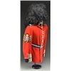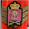 3) TUNIC. The Coldstream Guards tunic is red with 9 unit buttons down the front. The collar is dark blue with an 8 pointed white star on either side showing a central St. George's Cross. The blue epaulettes have a white Tudor rose emblazoned on them. Each cuff has 4 Coldstream Guard buttons & the distinctive insignia of a Coldstream Guard Color Sergeant is on the right sleeve. CONDITION: all pieces show very light wear & display beautifully. (02-16420/BF). $250-500.