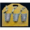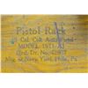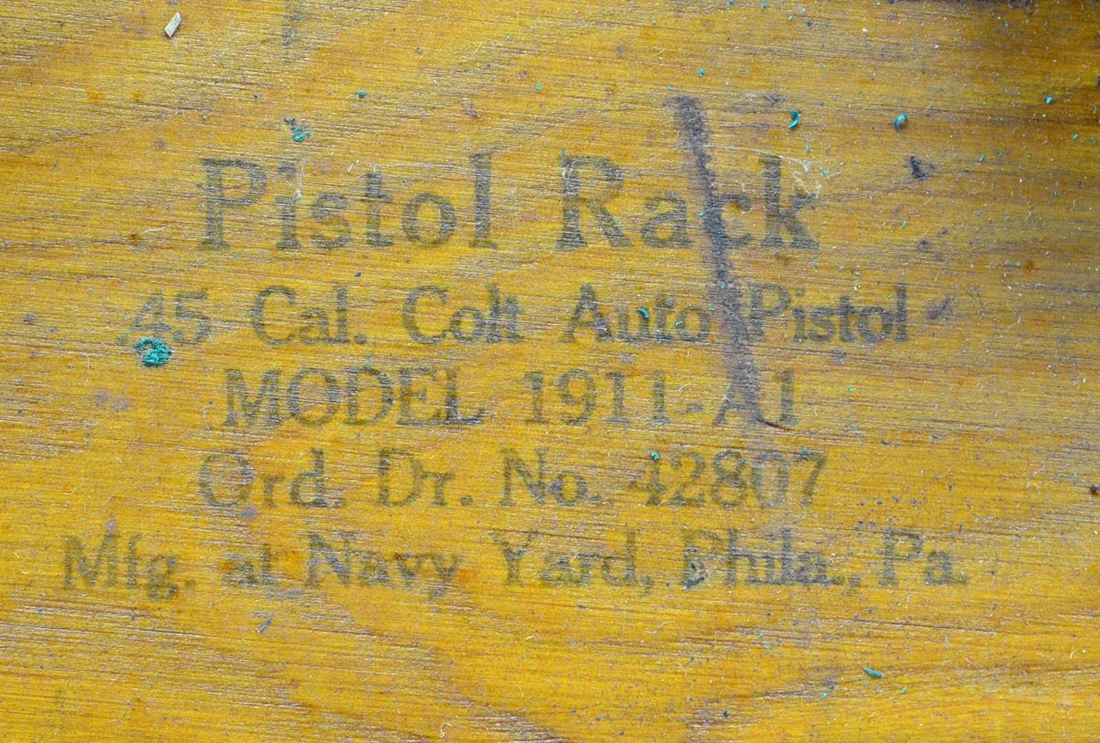 An interesting WW2 issue wood and leather rack used aboard U.S. Navy Ships to secure 6 Colt 1911A1 Automatic Pistols. Construction is wood & leather, secured w/ brass screws. Dimensions are 18" W x 15.75" H. Both sides marked; "PISTOL RACK / .45 CAL COLT AUTO PISTOL / MODEL 1911A1 / ORD. DR. NO. 42807 / MFG. AT NAVY YARD, PHILA., PA.". CONDITION: Still retains all leather holsters, straps & screws. Leather has stiffened over the years but doesn't appear cracked or damaged. Typical "greening" around brass at leather connection points. Original lettering still readable on both sides. Wood retains original finish & is structurally solid. (02-17437-6/JZ). $150-250.