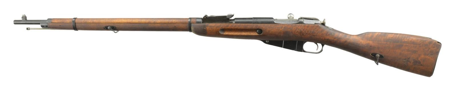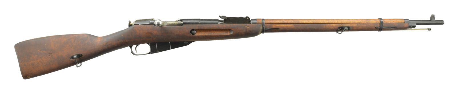 Cal. 7.62x53R. S# 57234. After the Winter War of 1939-1940, Finland captured a significant number of Soviet 91/30s. The Tikka arsenal reworked 24,000 rifles giving them newly made bbls. & birch stock sets. CAI import marked 28.7" bbl. w/ stepped front sight, 2,000m tangent rear sight & 1944 date. Re-purposed Soviet 91/30 receiver, mag. assembly, cleaning rod & buttplate have non matching or no numbers. Birch stock set has sling swivels. CONDITION: good to very good overall condition. Good metal w/ mag. assembly refinished over prior pitting & marks throughout. Very good wood w/ series of marks on toeline of stock. Very good bore.