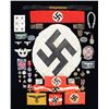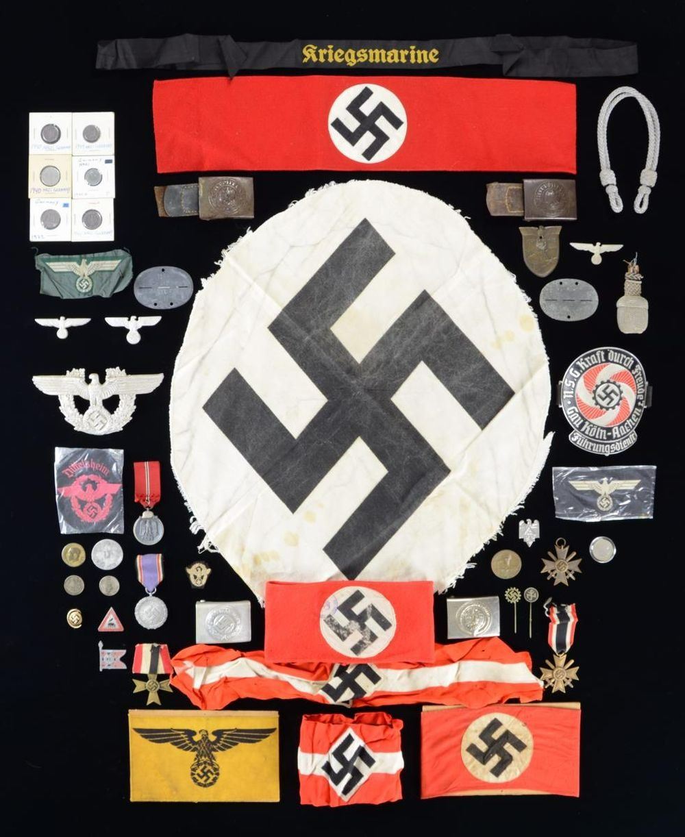 & MORE. This varied lot consists of 1 yellow & black State Service armband. / 1 Sewn cotton party armband. / 2 Sewn wool party armbands. / 2 Cotton HJ armbands. / 1 Black printed party symbol on a circular white cotton field for a flag. / 2 Army enlisted man’s belt buckles. / 1 Aluminum police belt buckle. / 1 Plated HJ belt buckle. / 2 German dog tags. / 1 Luftschutz Medal with ribbon. / 1 Russian Front Medal with ribbon. / 1 War Merit Cross with swords & ribbon. / 1 War Merit Cross, without swords, on incorrect ribbon bar. / 1 War Merit Cross with swords, no ribbon. / 1 Aluminum DAF arm shield that reads “N.S.G. Kraft durch Freude Gau Koln-Aachen Fuhrungsdienst”. Shield is complete with original arm strap. / 1 Aluminum police shako eagle with missing & damaged attachment screws. / 1 Police cap eagle. / 2 Army cap eagles. / 6 Coins from 1 pfennig to 2 mark. / 1 Pre-WWII coin. / 2 Post-WWII coins. / 1 Krim shield with no pins & holed. / 1 DAF stick pin. / 1 National Socialist People’s Welfare stick pin. / 6 Plastic & metal tinnies in rough condition. / 1 Kriegsmarine cap tally. / 1 Fire Police sleeve eagle. / 1 Army cotton breast eagle. / 1 Panzer breast eagle. / 1 Police M43 style cap eagle. / 1 Silver bullion sword knot acorn only. / 1 Silver bullion officer’s chinstrap. CONDITION: all items show light to moderate wear, except as noted above. (02-21283/BF). $500-800.