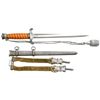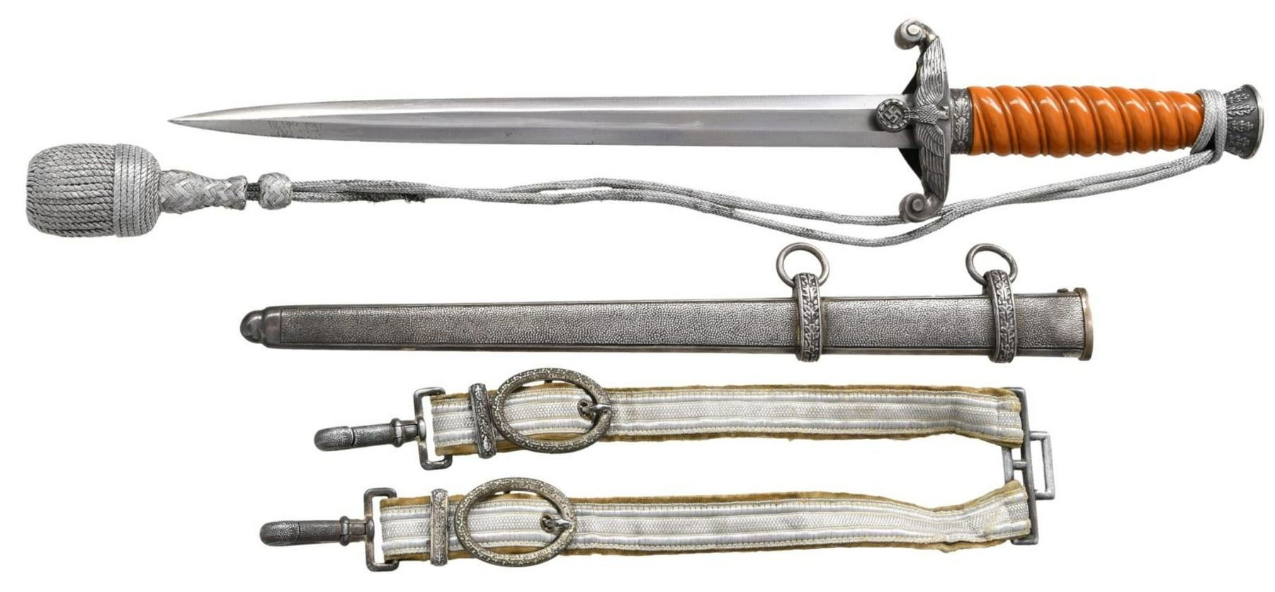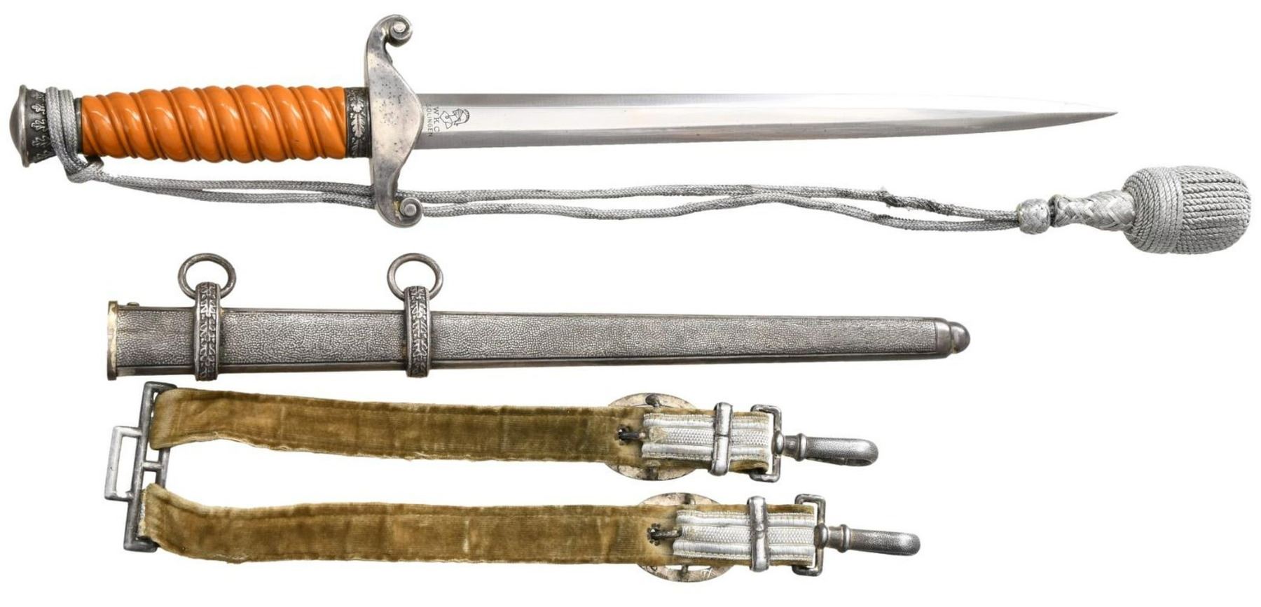 Overall length: 15 5/8”. Plain blade marked on the reverse “(knight’s head) WKC SOLINGEN”. Plated eagle crossguard with oak leaf embellished ferrule & pommel. Deep orange grip with improperly tied correct knot. Plated scabbard with correct hangers attached. CONDITION: blade is quite nice, showing light scabbard wear. Hilt shows light wear with minimal tarnish. Knot has a few areas of wear to the bullion. Scabbard shows only tarnish. Hangers are solid. (02-21335/BF). $400-600.