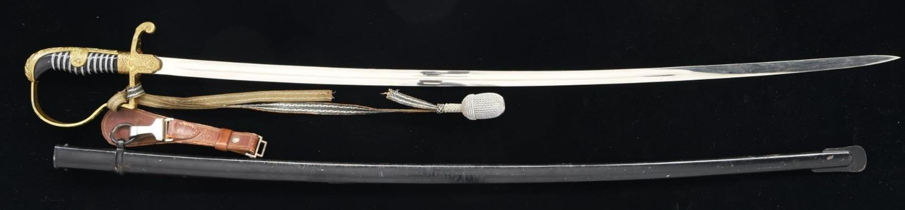 Overall length: 39”. Blade length: 32 3/4". Blade has a single fuller and is marked near the hilt “ORIGINAL (squirrel) Eickhorn SOLINGEN”. Gilded brass hilt with an Army eagle & party symbol forming the crossguard & languet. Oak leaf embellished knuckle bow, bird's head pommel, and backstrap. Aluminum wire-wrapped black composite grip. There is an Army sword knot attached to the hilt. Scabbard has a black enameled finish and has an incorrect brown leather hanger attached to the suspension ring. CONDITION: blade shows original factory polish. Hilt shows very light wear. Knot has a broken strap and overall moderate wear. Scabbard has 95%+ finish. (02-20897/BF). $300-400.