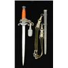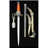 Overall length: 15 1/2". Blade marked w/ knight’s head logo "W K C / SOLINGEN”. Plated crossguard, pommel & ferrule. Composite orange grip w/ silver knot attached. Plated scabbard w/ hangers. CONDITION: very good blade w/ light tarnish & marks. Plating on scabbard, pommel, crossguard & ferrule are dark tarnished w/ specks & spots of plating in protected areas. Very good intact appearing grip. Knot has significant fraying & exposed loose cords. (02-16192/MD). $400-600.