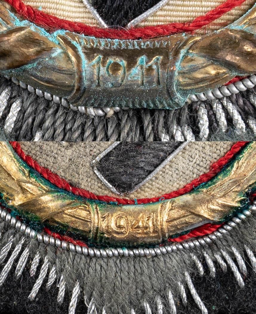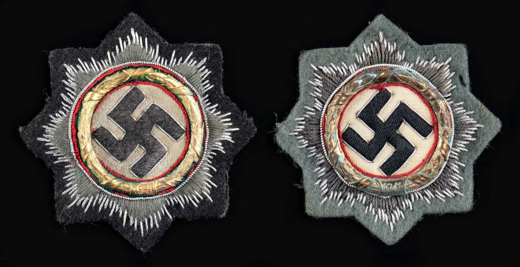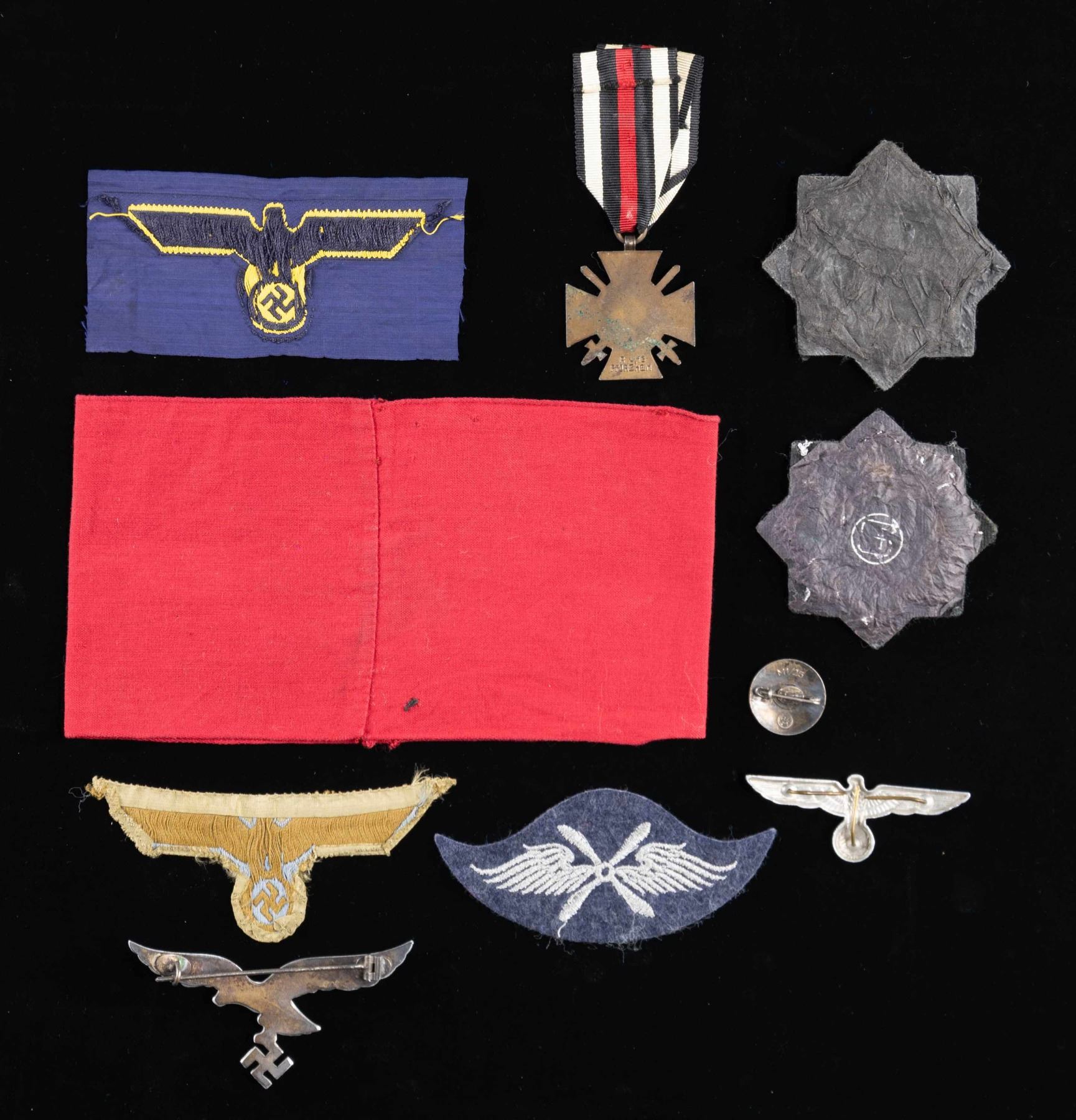 This lot of WWII German items includes 1 embroidered style Party armband, 1 bevo sewn Kriegsmarine breast eagle, 1 Wehrmacht Afrika Corps breast eagle, 1 aluminum Army cap eagle, 1 aluminum Luftwaffe cap eagle, 1 Party pin, 1 WWI War service cross with swords and ribbon, 1 Luftwaffe specialty patch, 1 cloth German Cross on field green with a well detailed wreath, and 1 cloth German Cross on black with a well detailed wreath. CONDITION: all items show light wear overall. (02-25581-3/BF). NON-GUN. $700-1,000.
