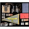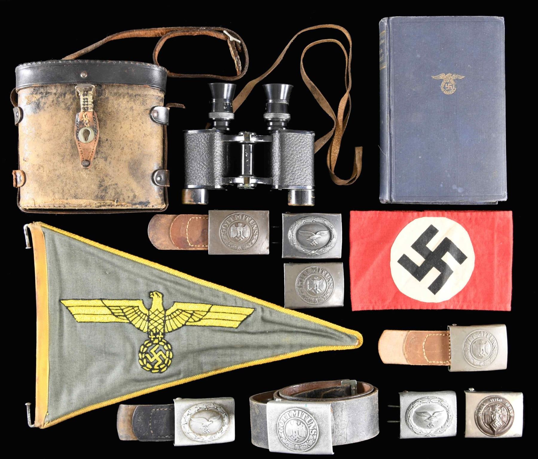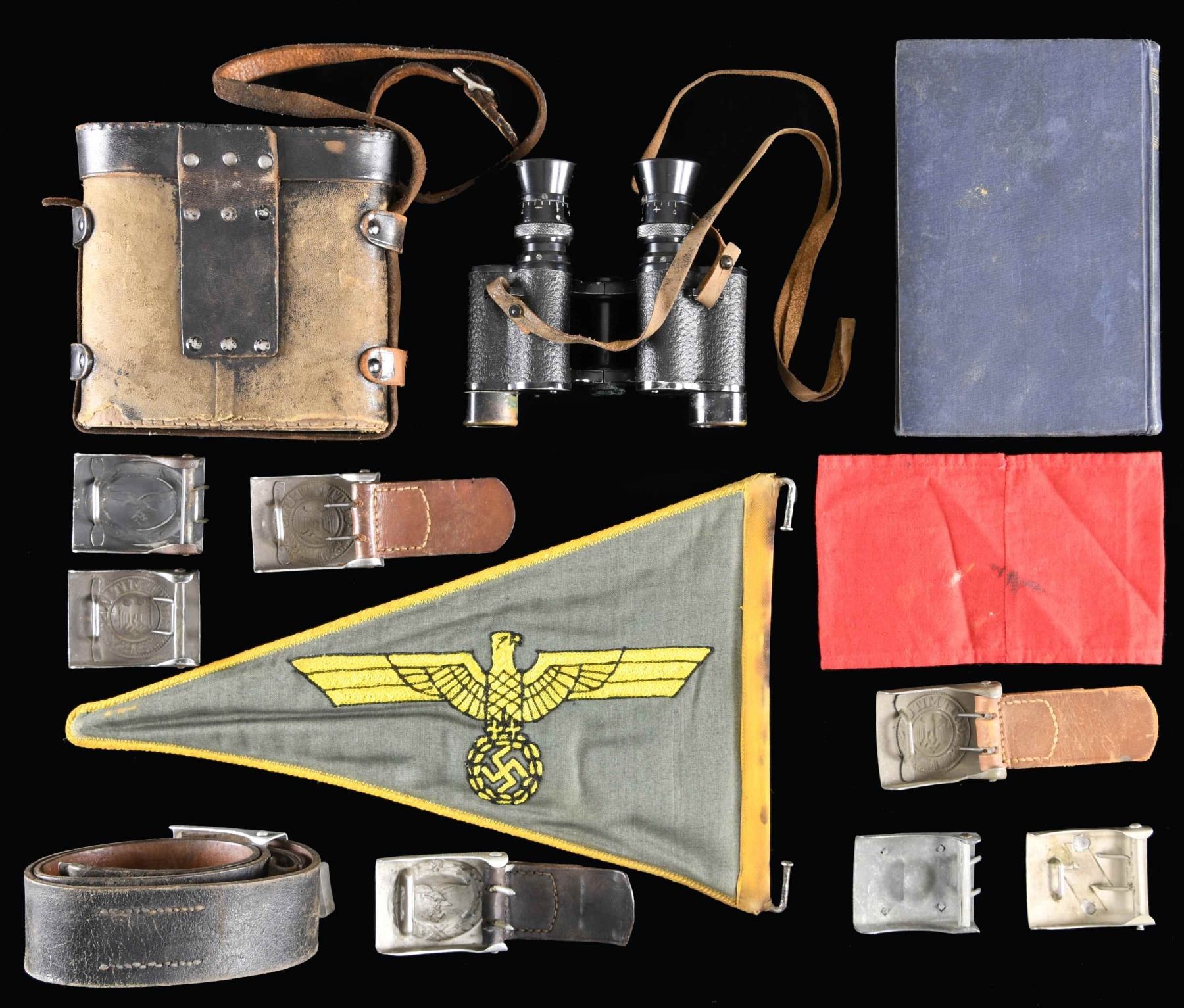 This fine WWII German lot includes 1 / Kreigsmarine Officer's pennant featuring a yellow embroidered eagle on a faded blue field. Pennant includes its original plastic cover that has some wear and losses. 1 / Copy of "Mein Kampf" published in 1935 in Munich. Dark blue binding with gold embossed early Party eagle on the cover. 1 / Pair of binoculars marked "ZEIT Fischer & C Berlin" & " BERLIN 8 X 30 G m. b. H. L316". Original very worn case included. 3 Luftwaffe belt buckles. 3 Army belt buckles. 1 / HJ belt buckle. 1 / Army belt buckle on its original belt, 1 / Party armband with a printed black Party symbol on a sewn white circular disk all on a red field. CONDITION: all items generally show light wear except as noted above. (02-24501-1/BF) $700-1000.