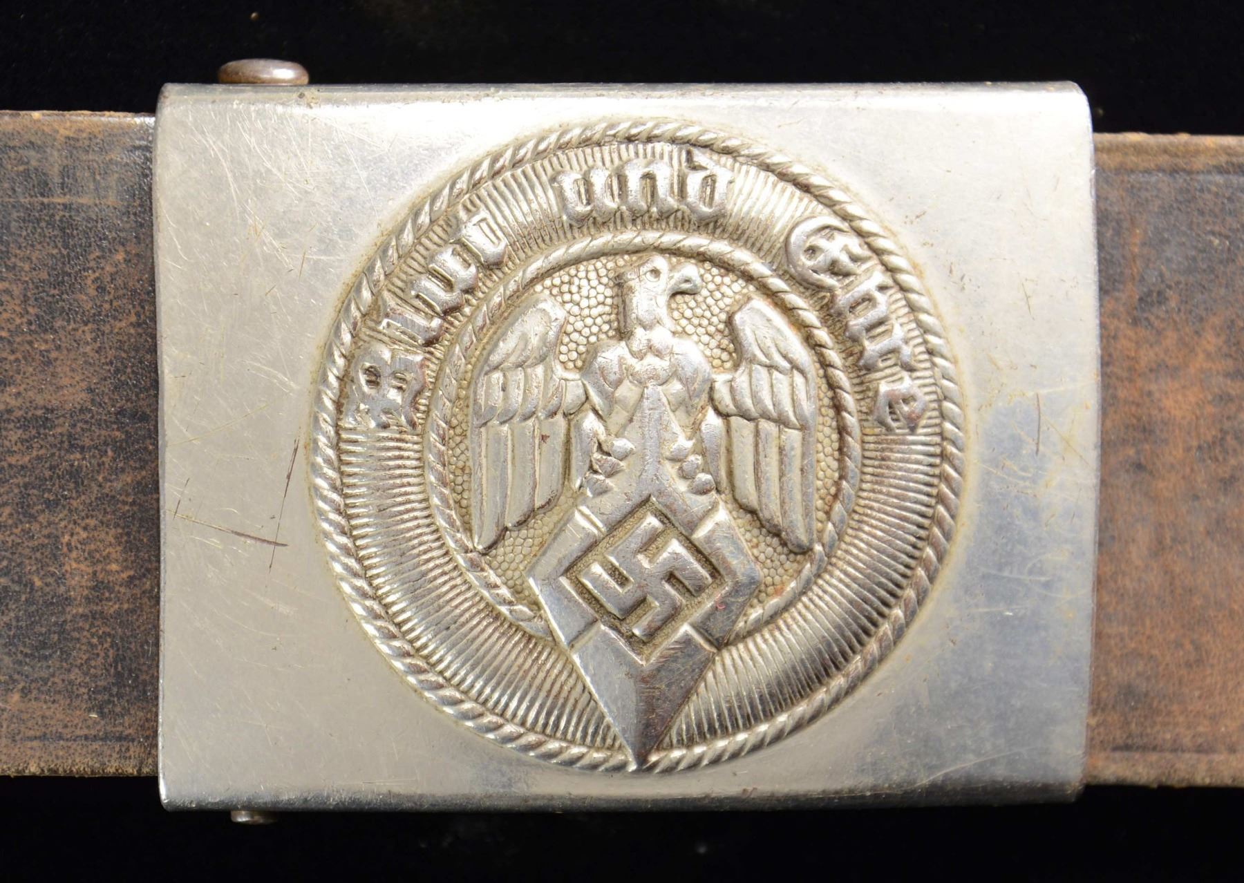 This lot includes 1 Wehrmacht belt buckle with a green-painted finish and leather tab, dated 1940. / 1 Small-size political leader’s belt buckle in brass with a silver central device. / 1 Large-size political leader’s belt buckle in brass. / 1 HJ belt buckle with a plated finish. / 1 SS belt buckle. This buckle is unmarked but appears to be original. / 1 HJ belt buckle with a plated finish and dark brown leather belt. CONDITION: all buckles are complete and undamaged. They all do show usage wear. (02-23295-3/BF). $800-1,100.