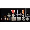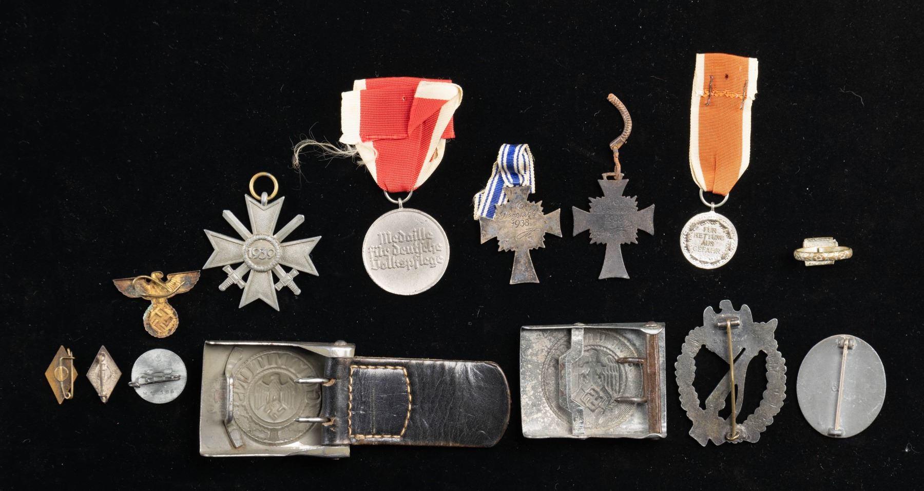 This assorted lot of WWII German artifacts includes 1 Army belt buckle, 1 HJ belt buckle, 1 Silver Wound Badge with a zinc finish, 1 Late war painted Party pin, 1 Bronze Mother's cross with a short ribbon, 2 HJ membership pins, 1 War Merit cross with swords but no ribbon, 1 Infantry Assault Badge marked on the reverse " S.H. u. Co. 41 ", 1 Pot metal ring with a Party symbol, 1 Gold colored eagle for a political leader's collar tab, 1 Relic bronze Mother's cross in poor condition,1 Pre-war medal for rescue from danger, and 1 Public Welfare medal with ribbon. CONDITION: all items show light wear except as noted above. (02-25436/BF). NON-GUN. $500-700.