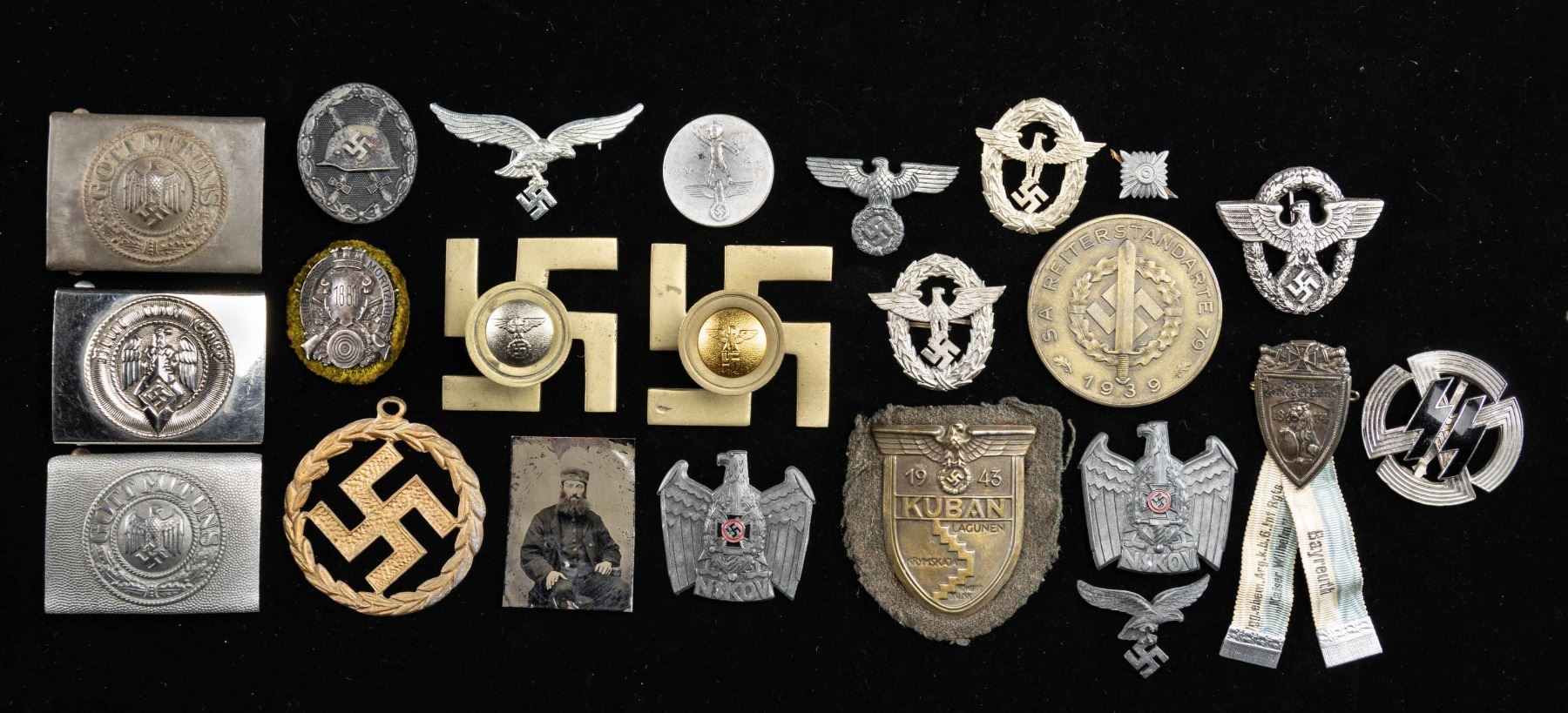 This varied lot includes 1 HJ belt buckle, 1 Aluminum Army belt buckle, 1 Steel Army belt buckle, 1 Kuban sleeve shield with backing, 1 pair of small brass candle sticks with Party symbol bases, 1 Zinc Party symbol pendant, 2 NSKOV pin back membership badges, 1 SA horsemanship riders desk medal, 2 Early Police cap badges, 1 Black Wound badge, 1 Shooting badge from 1881, 1 Rank pip, 1 Tinnie, 2 Political leader's buttons, 1 Bayreuth veteran's badge from 1874, 1 Political cap eagle, 1 Small cast Luftwaffe eagle, and 1 small Franco Prussian War era tintype photo. Also included is a reproduction Police cap badge and an SS Proficiency badge. CONDITION: all items show light wear and some use. Kuban shield shows moderate wear. (02-25469/BF). NON-GUN. $400-600.