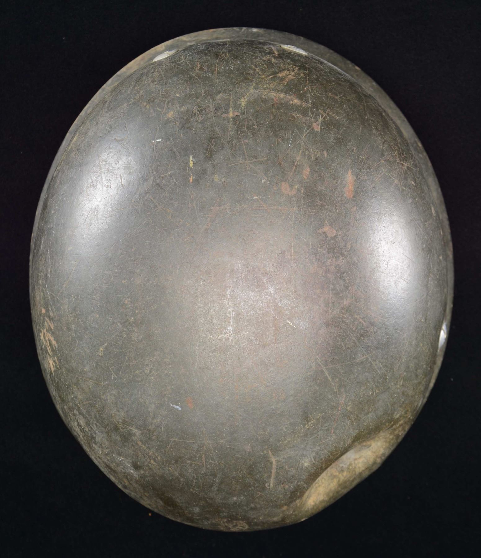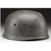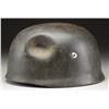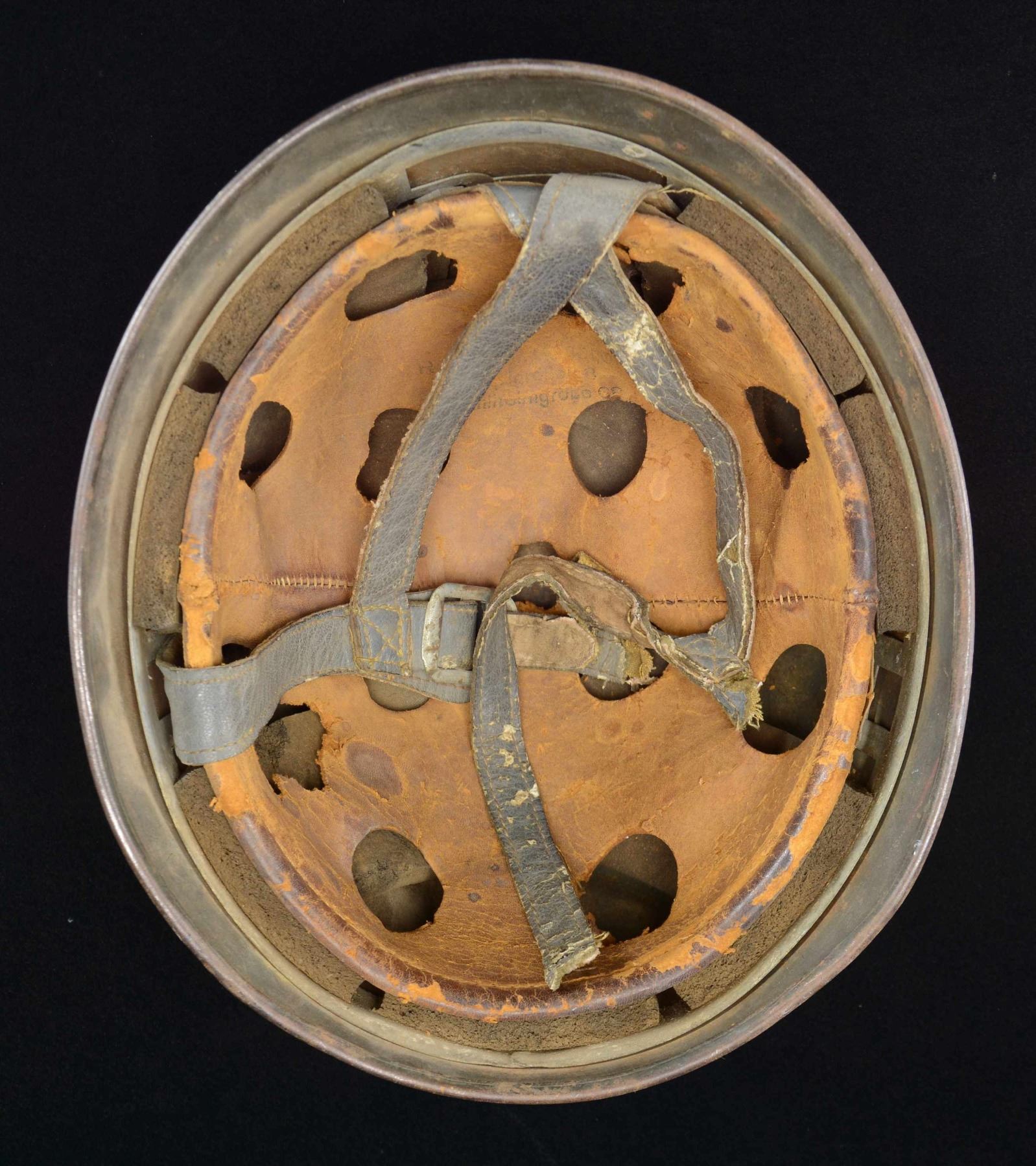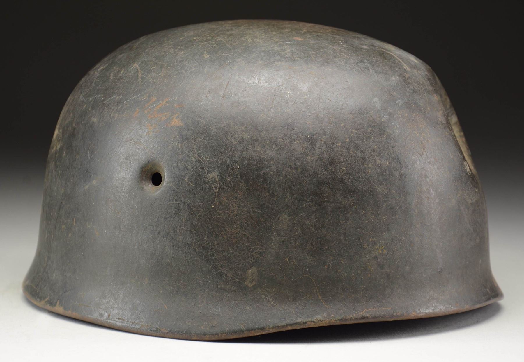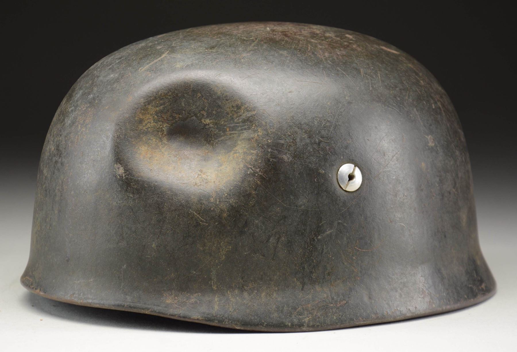 HELMET. A rare original late-war German Fallschirmjager (paratrooper) helmet. This helmet has quite obviously been struck by a bullet in the area of the left temple. The bullet did not penetrate the helmet, but the impression of the slug and the depression around it can clearly be seen. Helmet has a dark gray/blue-painted finish with aluminum fasteners connecting the band. The interior rear appears to be stamped "CKL68" and "465", but the stamping is quite difficult to read. The original liner is dry with minor losses, and the remains of interior ink stamps can be seen. The chinstrap is mostly present but quite deteriorated. A poignant souvenir salvaged from a battlefield and worn by a German paratrooper that may or may not have survived the bullet strike to his helmet. CONDITION: helmet finish appears to be better than 90%. One aluminum fastener is missing. Liner is dry but nearly complete. Chinstrap shows heavy wear. (02-22650-1/BF). $3,000-5,000.