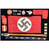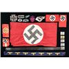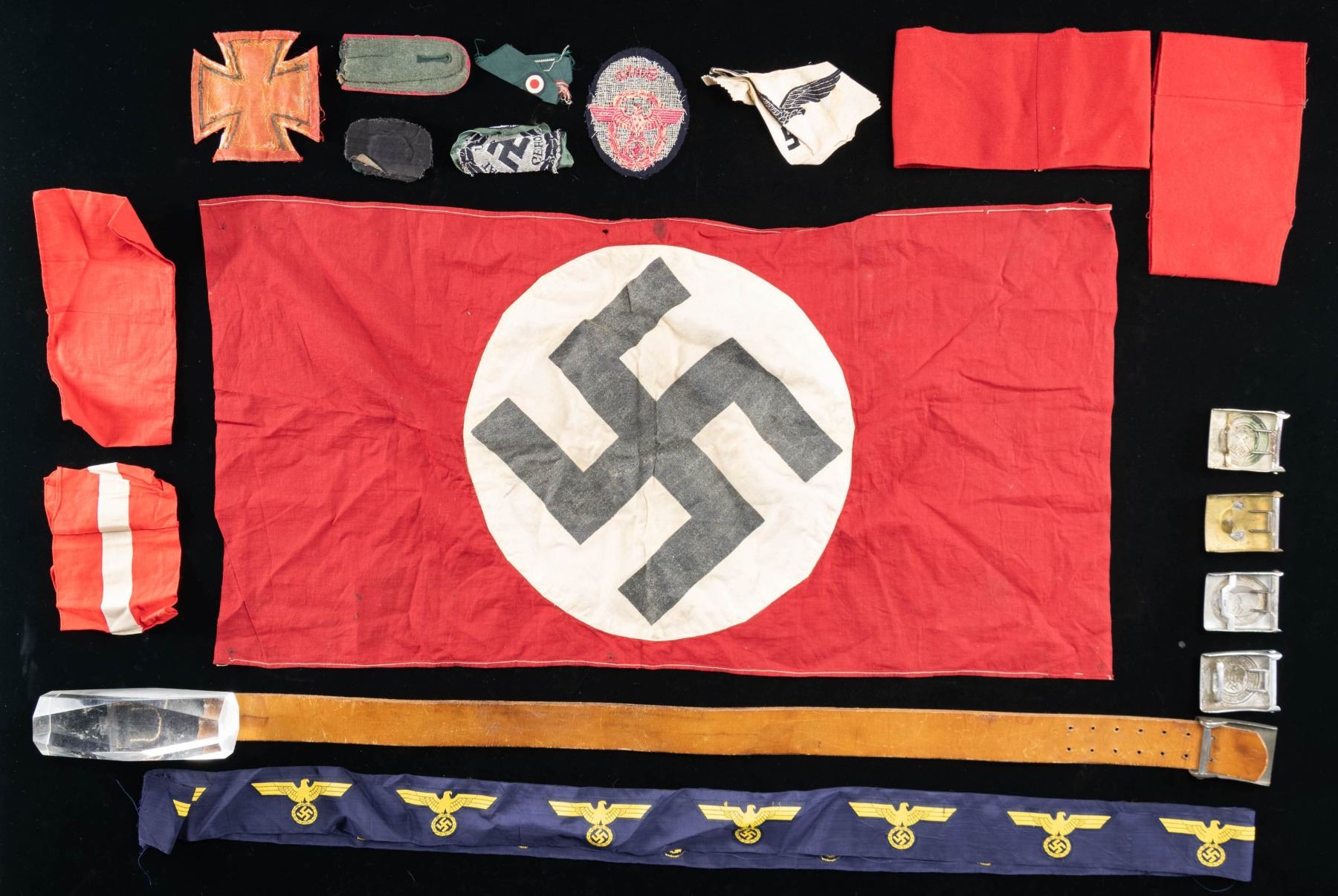 This expansive lot includes 1 HJ armband, 2 Wool Party armbands, 1 SA Wehrmannschaft armband, 1 uncut unissued roll of 16 enlisted Coast Artillery breast eagles, 1 small Luftwaffe sportshirt eagle, 1 Pink and black Police sleeve eagle, 1 Army cap eagle and cockade for an m43 type cap, 1 Army corporal of Artillery shoulder board, 1 Bullion hat wreath, 1 cloth Maltese cross of unknown origin, 1 SS-Schuma Sicherheitspolizei sleeve insignia, 1 small Party flag measuring 29" x 16", 1 Wehrmacht enlisted belt and buckle, 1 HJ belt buckle, 1 SA or early political belt buckle, 1 Aluminum Army belt buckle, and 1 Aluminum Luftwaffe belt buckle. CONDITION: all items show light to moderate wear except as noted above. (02-25769/BF). NON-GUN. $700-1,100.