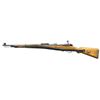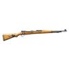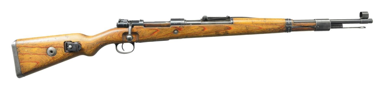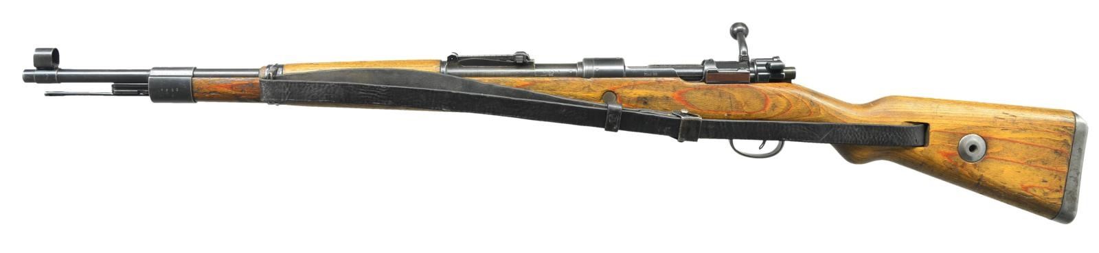 ACTION MILITARY RIFLE. Cal. 8mm Mauser. S# 8622ak Bbl. 23 5/8". All visible numbers match. Receiver ring marked on top "dot (German Eagle 63) & 1944". Receiver ring marked on right side w/ 2 German eagles; only one is numbered 63. German eagle proof on left side. Bbl. is marked on right side over chamber w/ "dot" over 13 in shield. Tangent rear sight graduated to 2,000 meters. Inverted V front sight w/ protective hood. Bayonet bar and cleaning rod are present. Upper band is solid machined; lower band is stamped welded type. Stamped trigger guard & floorplate; floorplate is marked w/ an "LU" & trigger guard has German eagle "135" acceptance mark. Laminated stock set; buttstock and hand guard are both marked "dot". Steel takedown hole & cup type buttplate. Original leather sling w/ wear & staining .CONDITION: stock set has moderate wear, staining, dents & scratches throughout. Small area of wood was removed on left side over trigger guard (by bored soldier). Metal has 75% original blue finish w/ light wear & handling marks. Very good shiny bore. (22-672/RW). CURIO. $500-700.