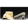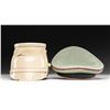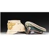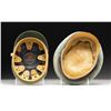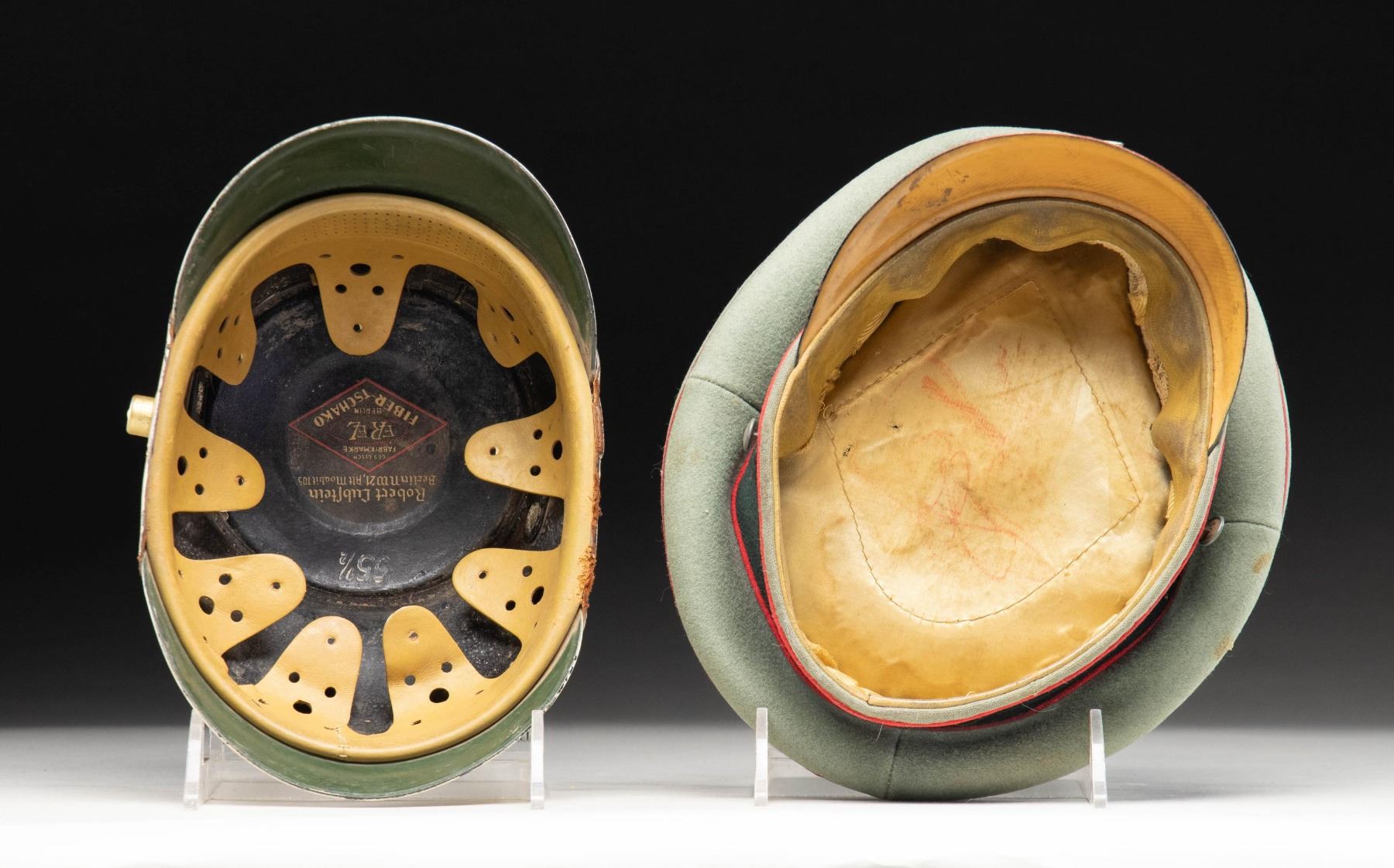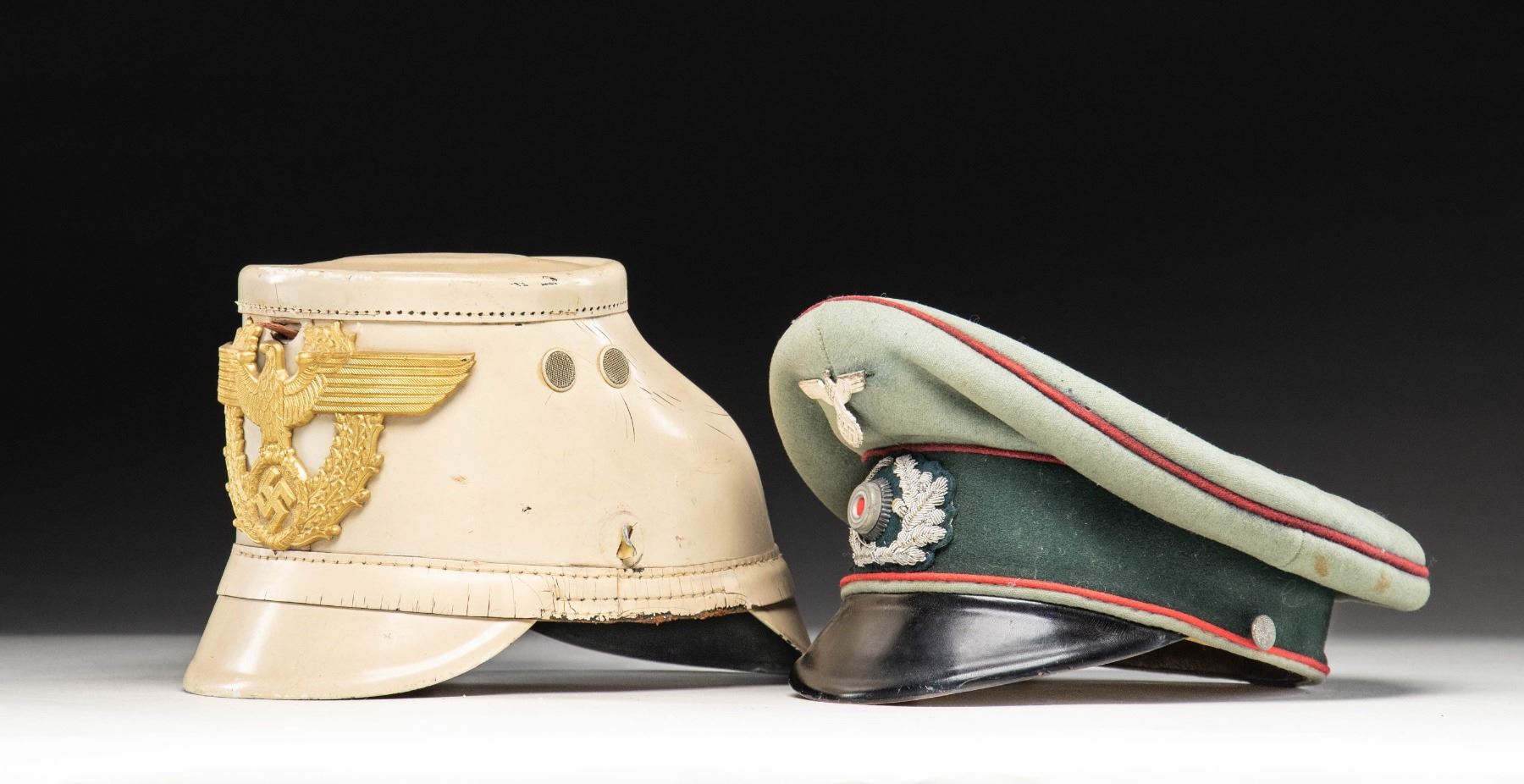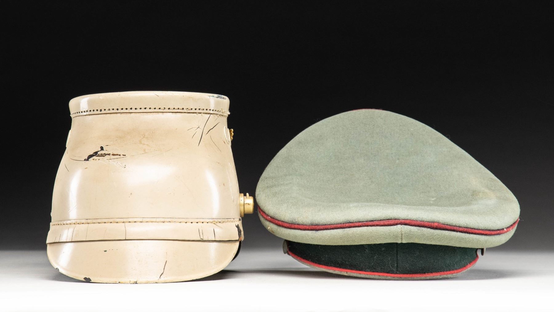 POLICE SHAKO. 1) Very nice early WWII German Army Artillery visor cap. The cap has a light sage green crown with a dark green band and red piping throughout. The front of the crown has an early silvered Wehrmacht eagle coupled with a bullion cap wreath on the band. Black visor with a tan underside. Tan sweatband cream colored liner. CONDITION: cap shows suprizingly light wear with only a few minor stains. The interior is well worn with ample sweat stains. The sweat shield is missing. 2) A rare white Police shako for the Traffic Police or Verkehrspolizei. White enameled leather body large gold Police eagle on the front with gold side posts. Nice Robert Lubstein label on the interior with the classic "EREL" diamond. Tan 9-tongue liner with integral sweatband. CONDITION there is no chinstrap or cockade. Finish is good with minor scuffs and finish cracks. The left side post is missing. (02-24216/BF). NON-GUN. $1,400-1,800.