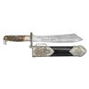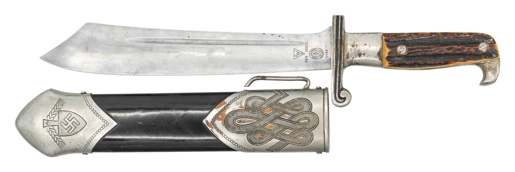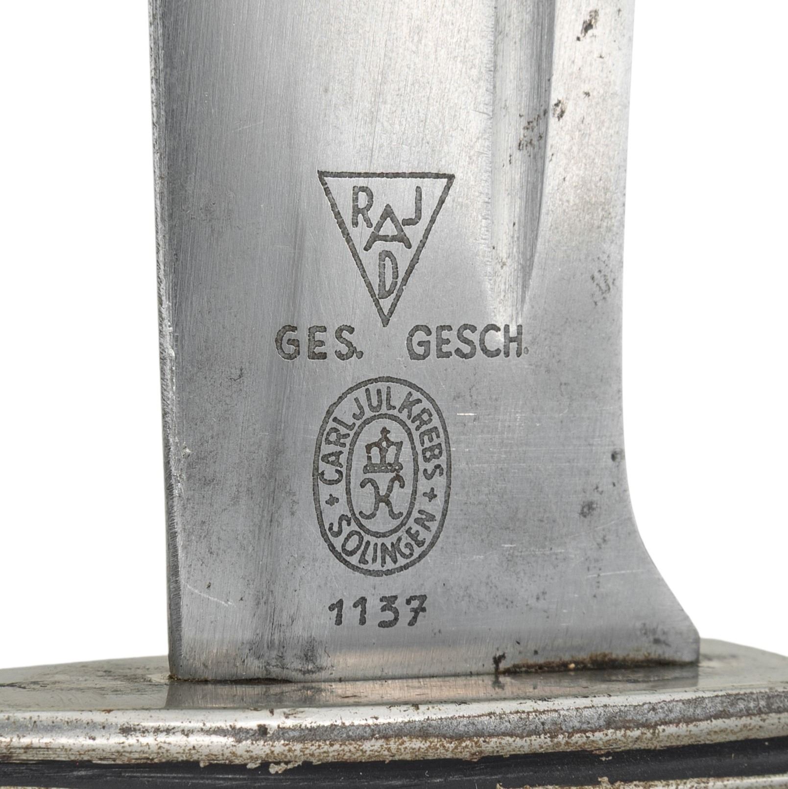 A nice example of a WWII German RAD hewer measuring 15 7/8" overall with a blade that is etched "Arbeit adelt" and marked "CARL JUL KREBS (logo) SOLINGEN 1137". & "RJAD GES. GESCH.". Plated hilt with an eagle head effigy pommel and 2 piece stag grips held on by 2 screws. Black enameled scabbard with plated mounts bearing the insignia of the RAD. CONDITION: blade retains good finish with scabbard wear. Hilt shows light wear with minor finish loss. Scabbard generally shows light wear 99% finish. The botton of the suspension loop has became detached. (02-26160/BF). NON-GUN. $600-900.