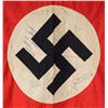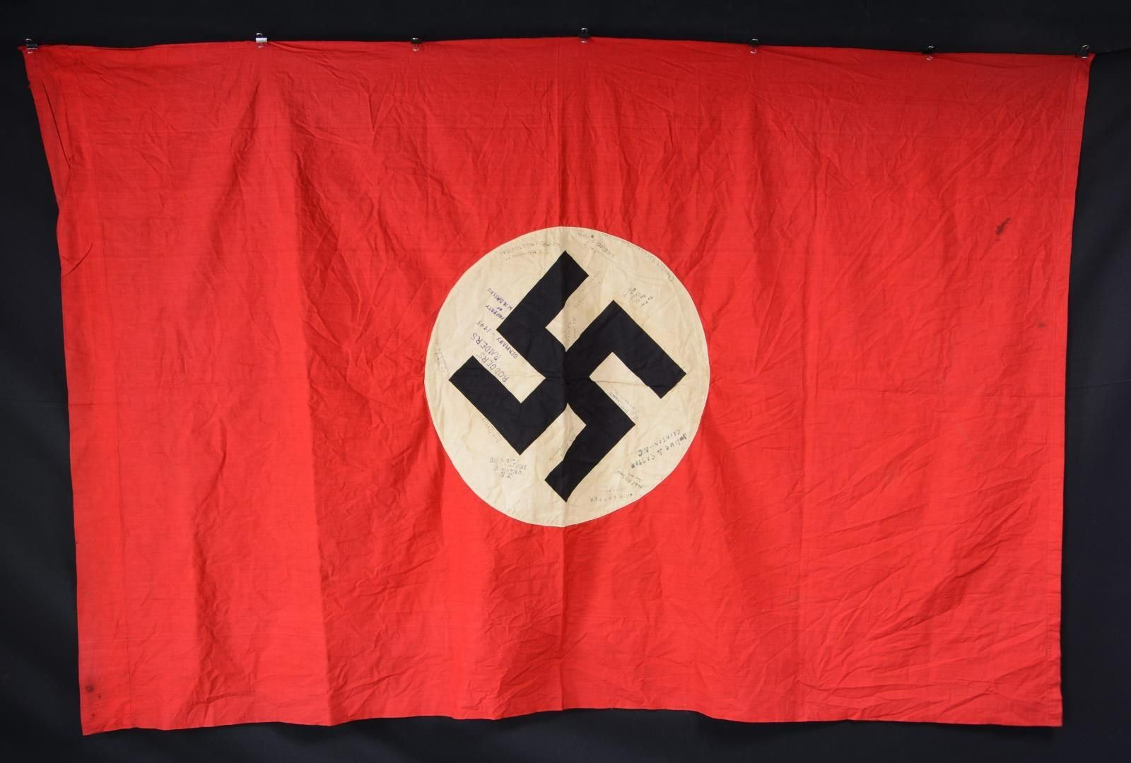 This flag is of standard design with a printed party symbol on a sewn circular white disc, all on a red field. The flag measures 76” x 49 1/2". The white disc is lettered “ROGERS' RAIDERS GERMANY – 1945 PROPERTY OF W.H. DRISKO”. Many members of Rogers' Raiders signed the white disc on one side of the flag. All inscriptions on the flag have been verified to be members of Rogers' Raiders. The unit was commanded by 1st Lieutenant Roy “Buck” Rogers of the 407th Infantry Regiment. The unit was formed by volunteers from several different units to conduct reconnaissance and combat patrols behind enemy lines. They were tasked with gathering battlefield intelligence, capturing prisoners, and eliminating the enemy when required. The last mission of this short-lived unit was led by Lt. Aamot deep behind enemy lines to locate a lost company and rescue allied prisoners. UNATTACHED ACCESSORIES: 3 photocopied pages with information about Rogers' Raiders and their exploits. CONDITION: flag is quite solid with no notable damage and few light stains. (02-20910/BF). $2,000-3,000.