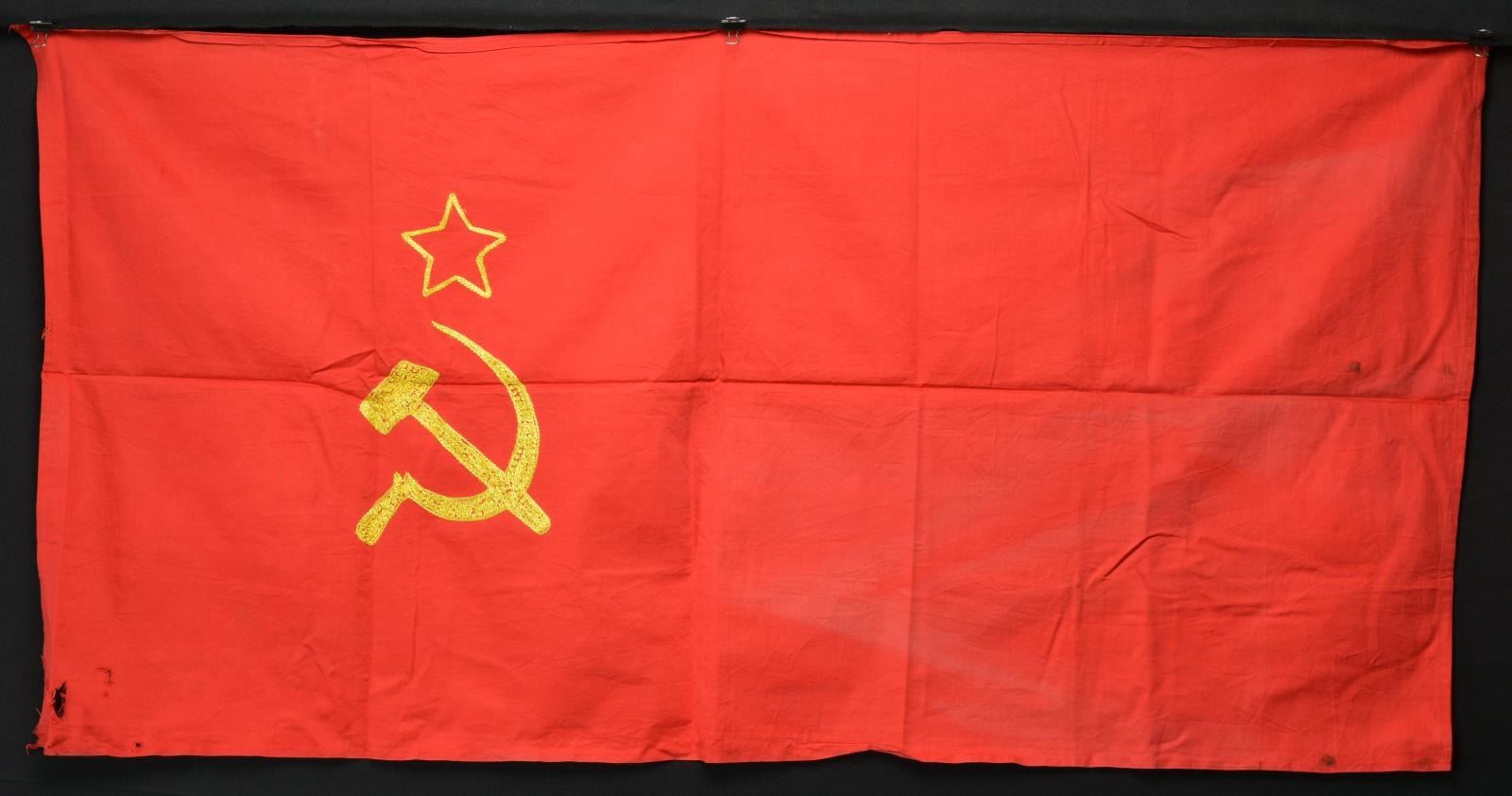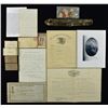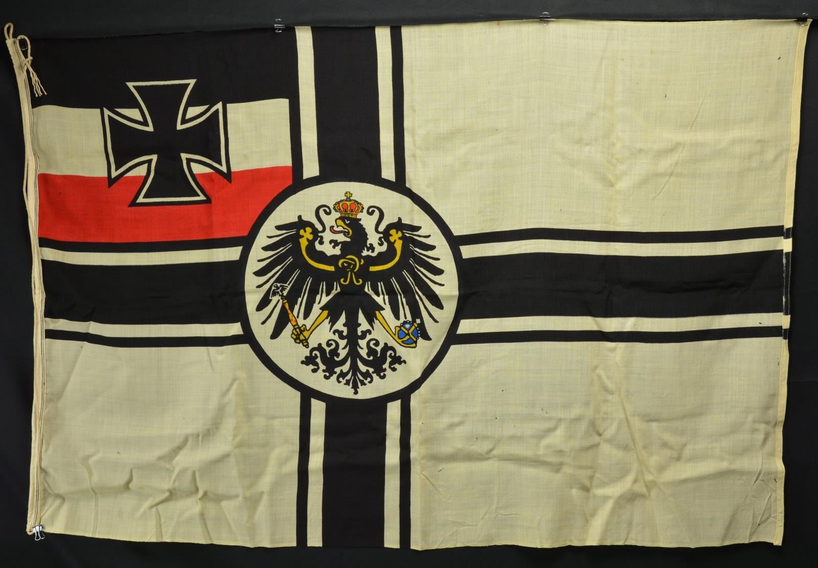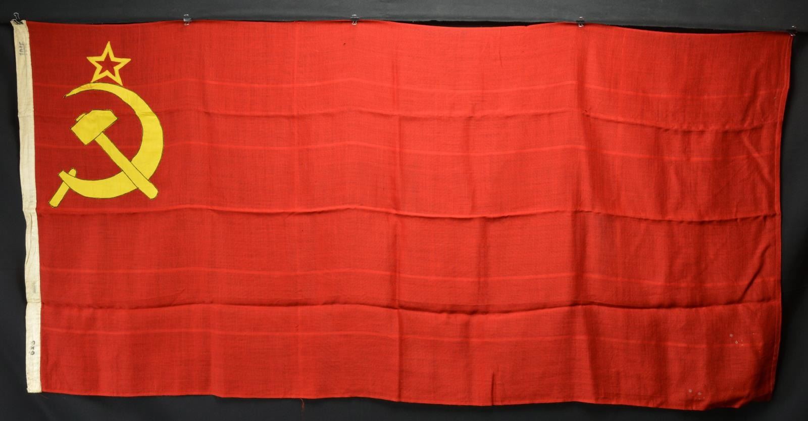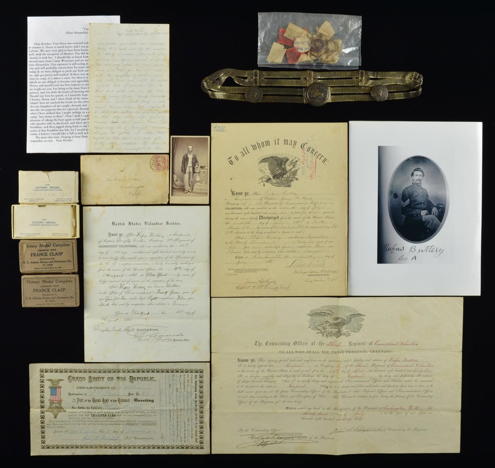 This varied lot includes 1 WWII German party banner featuring a sewn black party symbol on a sewn circular disc all on a red field. Banner measures approx. 58” x 23”. / 1 WWII German party banner featuring a printed black party symbol on a sewn circular disc all on a red field. The base and both sides have 1 1/4" white fringe edging. Banner measures approx. 31” x 20”, including fringe. / 1 WWII German battle flag featuring a printed black party symbol on a printed white circular disc all on a red field with a Maltese cross on the canton. The hoist is marked “Kr.Fl. 100x170” & “Lorenz Summa Sohne Oberkotzau”. Flag measures approx. 64” x 37”. / 1 WWI German battle flag featuring a black, yellow, blue & red printed eagle on a circular disc all on a white field with a Maltese cross on the canton. The hoist is unmarked but has a loop at one end and a length of rope at the other. Flag measures approx. 58” x 36”. / 1 Russian flag showing a sewn yellow hammer & sickle with star above on a red field. Hoist is marked “6X3 RUSSIA W (arrow) D LIVERPOOL 1945”. Flag measures approx. 72” x 36”. / 1 Russian flag showing an embroidered yellow hammer & sickle with star above on a red field. Flag measures approx. 46 1/2" x 23”. / 1 Italian WWII pennant measuring 13 1/4" x 7”. 4 WWII German armbands including Deutsche Wehrmacht, Red Cross, SA Sports, and a party armband. / 4 US Civil War documents belonging to Sgt. Rufus Buttery. Documents include an 1865 discharge, an 1861 Connecticut volunteer service enlistment, an 1861 Connecticut promotion certificate to corporal, and an 1896 GAR enrollment certificate. / 1 CDV of Calvin Nobles of the 17th Connecticut infantry along with a letter from him written from Camp Wells near Alexandria, Virginia. / 4 Empty issue boxes for the WWI US Victory Medal. / 1 Tattered cockade that reads “GENERAL COMMITTEE”. / 1 Victorian style women’s belt signed “PARISTYLE BUTTON CO.” featuring 8 Roman revival medallions on a 2-strand flat chain belt. CONDITION: flags generally show light wear and minor staining. One of the Russian flags is tattered on the ends. Ephemera shows expected wear. Cockade is quite tattered. Other items show light wear. (02-16912-4/BF). $500-700.