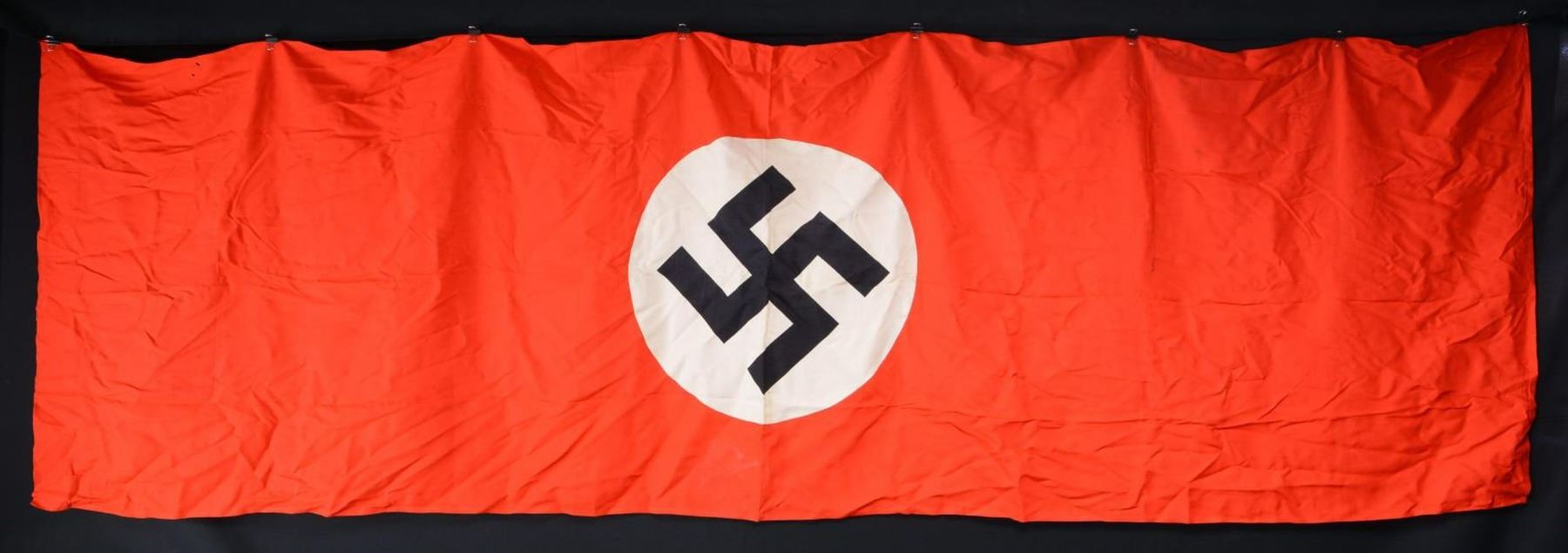 This lot consists of 1 party flag measuring 30” x 19” with a printed black party symbol on a sewn white disc, all on a red field. / 1 Party flag measuring 30” x 20” with a printed black party symbol on a sewn white disc, all on a red field. / 1 Party flag measuring 14 1/2” x 11” with a printed black party symbol on a sewn white disc, all on a red field. This flag has notable staining & a 1” hole. / 1 Party banner measuring 31” x 96” with a printed black party symbol on a sewn white disc, all on a red field. / 1 Party banner measuring 25 1/2” x 54 1/2” with a printed black party symbol on a sewn white disc, all on a red field. / 1 Party flag measuring 22” x 15 1/2” with a printed black party symbol on a sewn white disc, all on a red field. / 1 Party flag measuring 29” x 18 3/4” with a printed black party symbol on a sewn white disc, all on a red field. / 1 “DEUTSCHER VOLKSSTURM WEHRMACHT” armband. / 1 Kyffhauserbund armband. / 1 German Red Cross armband. / 1 Cotton sewn party armband. / 1 Party pennant measuring 8” x 14”. CONDITION: all items show light to moderate wear, except as noted above. (02-21286/BF). $700-900.