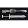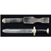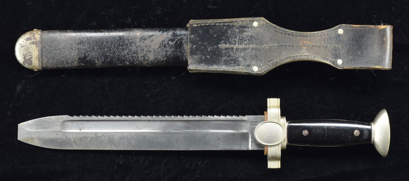 HEWER Overall length: 16 1/4". Single fullered blade w/ sawback spine marked "GES / GESCHUTZT". Plated pommel & crossguard having party eagle & symbol. 2 Piece black composite grips w/ the front grip checkered. Black painted scabbard w/ plated mounts. Black leather frog. CONDITION: blade w/ moderate marks on edge, patina & oxidation. Very good grips w/ oxidized screws. Good plating w/ edge wear. Good scabbard retaining finish w/ moderate marks, flaking & oxidation. Fir frog intact w/ moderate marks, mildew & flexing. (02-16187/MD). $400-600.