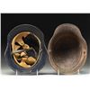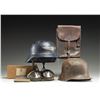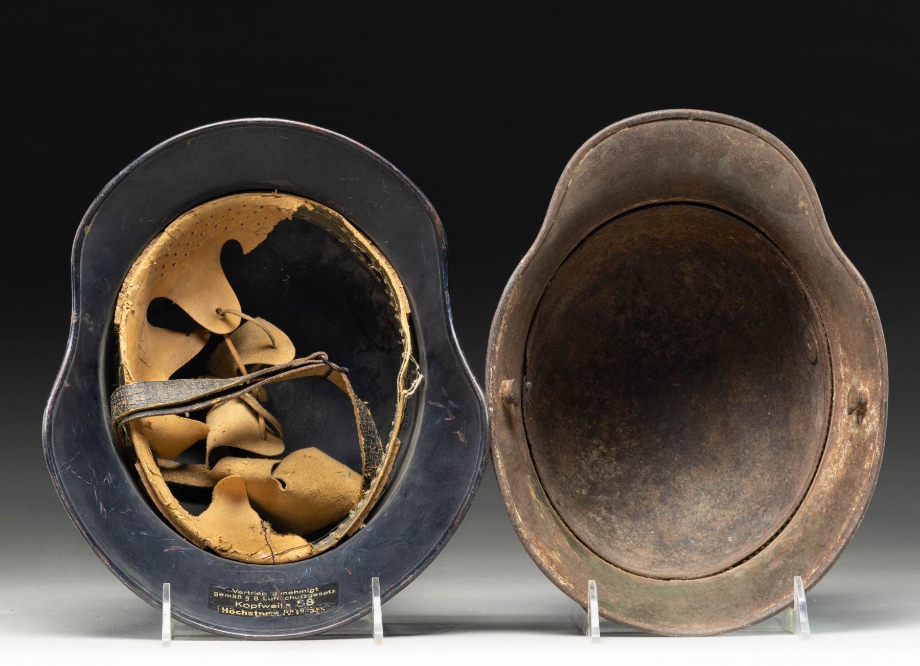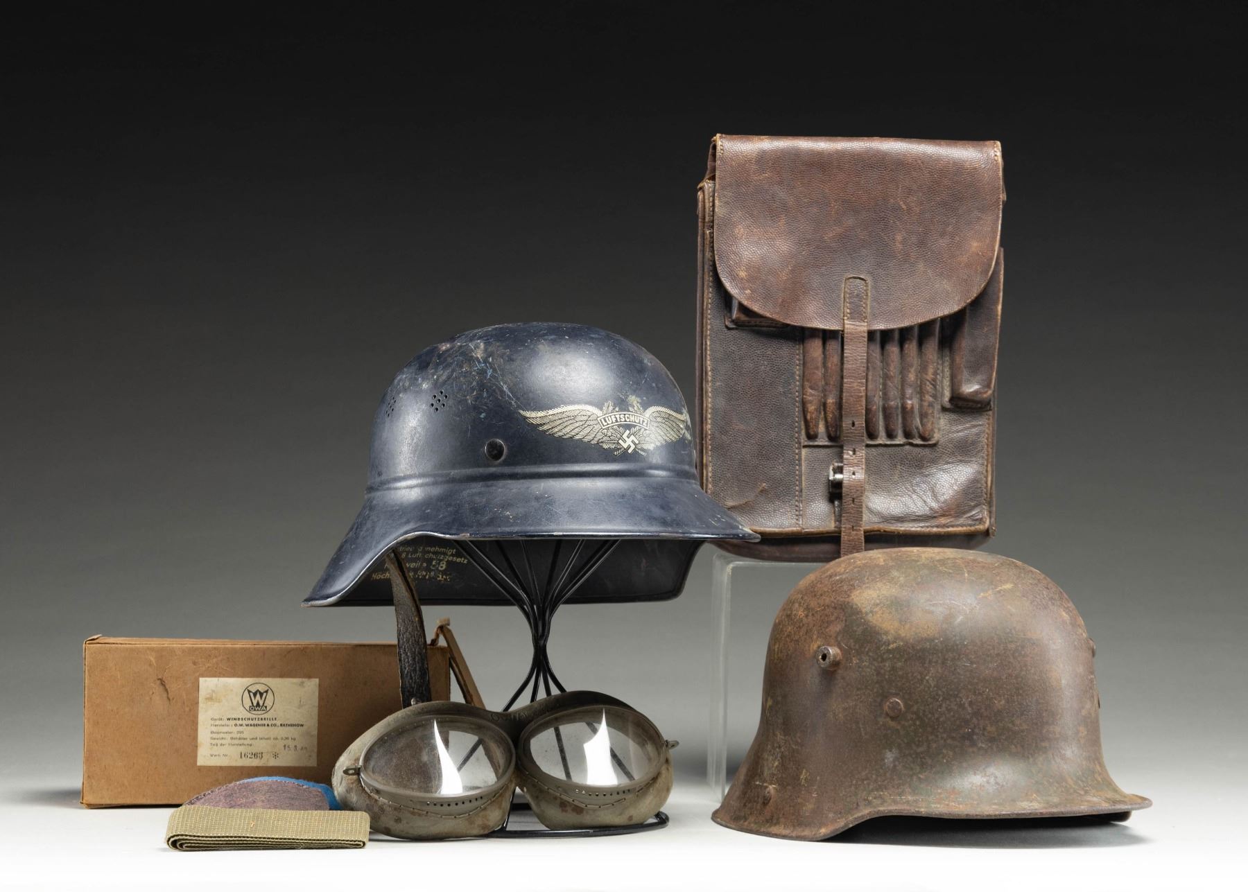 1) WWI German M1916/17 helmet with a field gray / green painted finish. The interior band is intact but there is no liner or chinstrap. CONDITION: helmet has an oxidized finish inside and out. 2) WWII German Luftschutz gladiator style helmet with a dark blue painted finish and a large Luftschutz decal on the front. The interior rear visor has a large white maker's decal. Leather chinstrap and liner. CONDITION: Helmet appears to have lost some paint, but has been repainted in these spots. Decal is 99%. Chinstrap is detached on one side and liner is in poor condition. 3) A leather WWII German map case measuring about 11" x 8" with a strap & buckle front. CONDITION: Light to moderate wear overall. 4) A pair of WWII German wind goggles in their original labeled box that includes a strap and spare lenses. The box is labeled " W OWA WINDSCHUTZBRILLE O.W. WAGENER & Co. RATHENOW. CONDITION: Box is worn with one end nearly detached. Goggles seem complete and solid. (02-25772/BF). NON-GUN. $300-500.