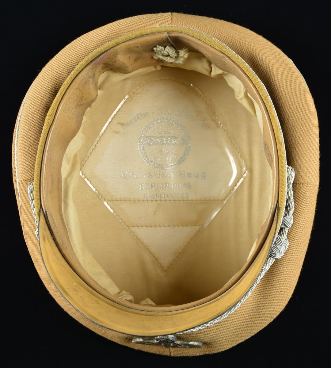 The crown of this hat is tan and the band is a high-grade black velvet material. The entire hat is piped in silver bullion with a matching silver bullion chinstrap terminated by pebble-finished buttons. The peak has a silvered political style eagle and the band has a central white, red & black enameled HJ diamond. Black visor with tan underside. Tan sweatband with ventilation holes in the front and an embossed mark that reads “DEUTSCHES LEDER” within a logo. Cream colored cotton liner with rounded diamond sweat shield. Hat reads under the sweat shield “Deutsche . Qualitatsarbeit GUT UND DAUERHAFT CARIHA Christian Haug BERLIN NO 18 Hochstestr. 29”. CONDITION: the exterior of the hat shows very light wear with expected tarnish on the silvered eagle. Sweatband shows some wear & staining, as does the liner. A wonderful example of a rare hat. PROVENANCE: From the Lifelong Collection of Glen E. Mattox. (02-18248/BF). $1,800-2,500.
