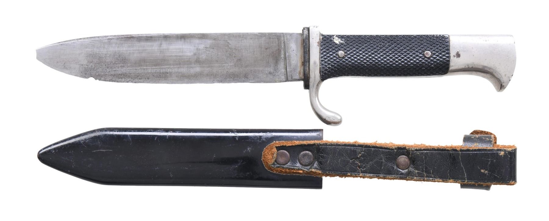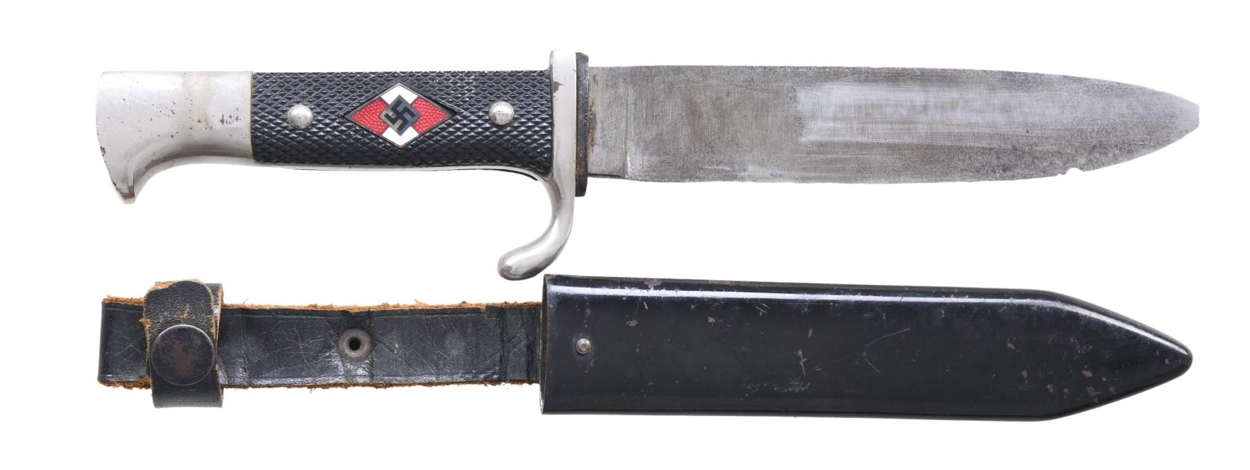 This knife measures 10 1/4" overall with a plain, unmarked blade. Plated crossguard and bird effigy pommel. Two-piece black composite grip with crosshatching. The front grip has an inset black, red, and white HJ diamond. Black enamel scabbard with an integral black leather frog. CONDITION: blade has a dark patina and has been sharpened. The edge of the blade shows a few small nicks, and the extreme tip is missing. Hilt and scabbard generally show light wear. (02-23386/BF). $150-250.