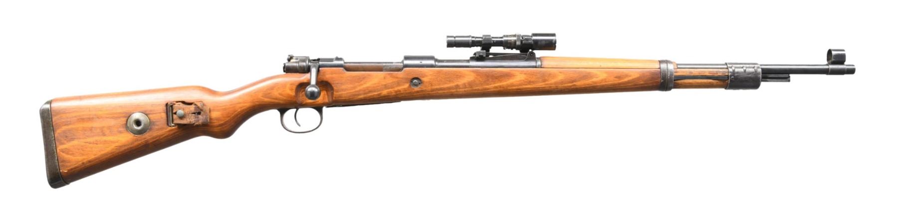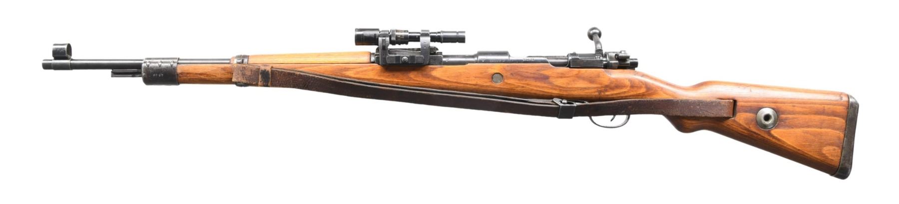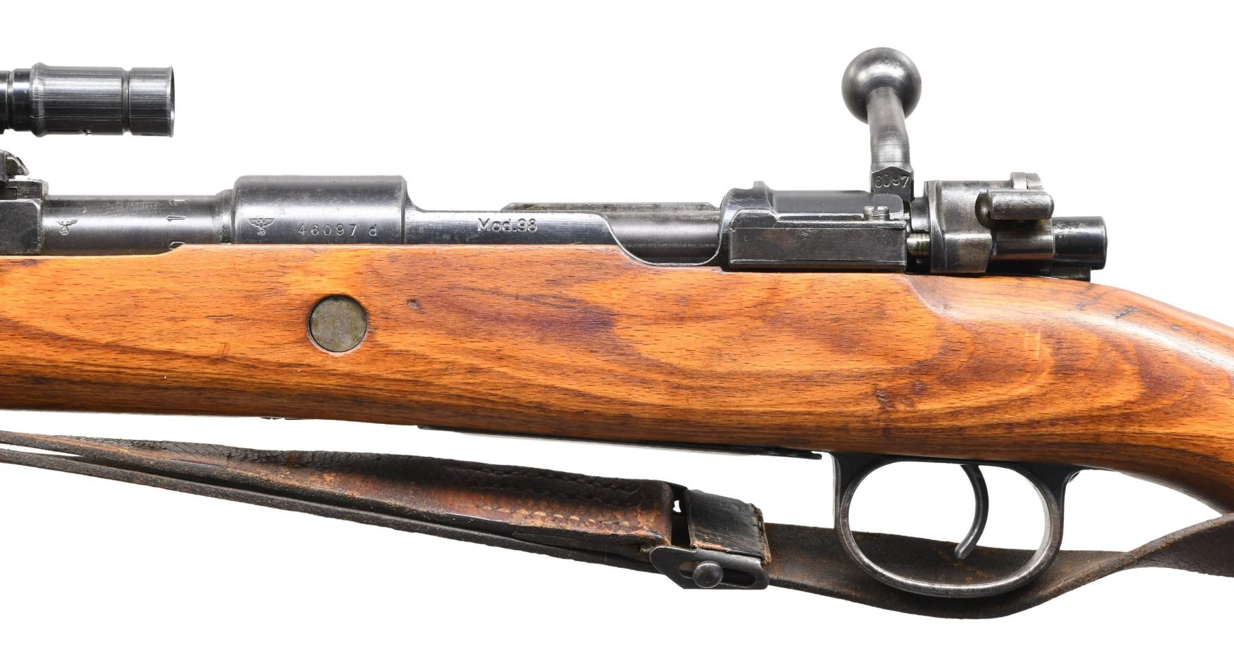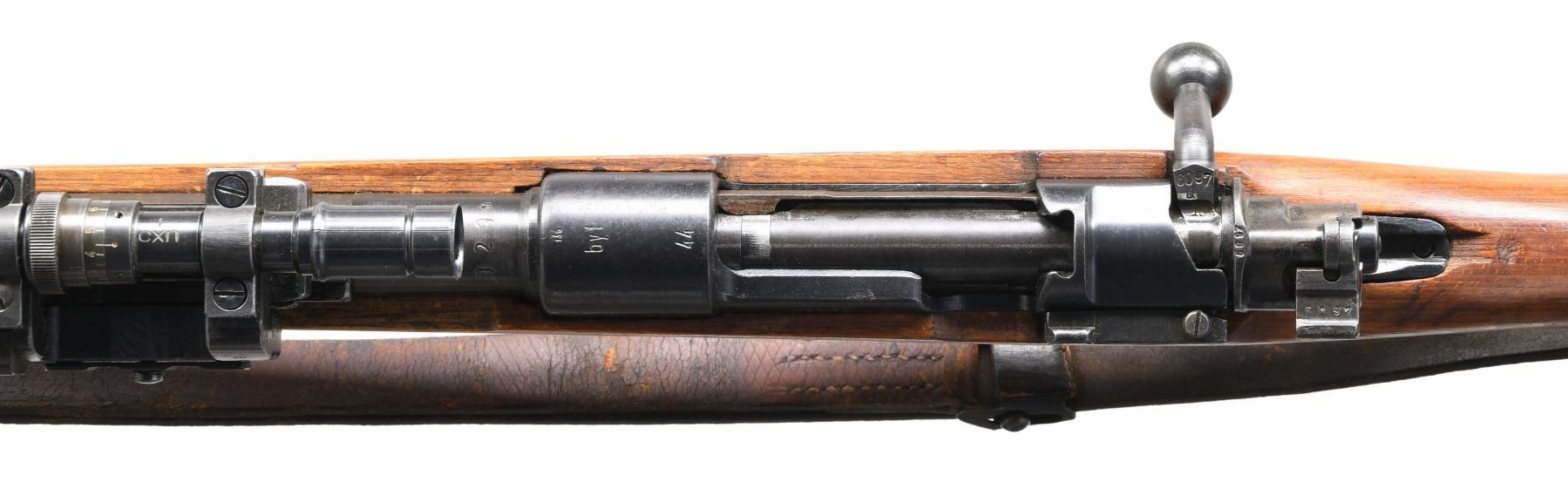 SCOPE. Cal. 8mm Mauser. S# 46097d . Bbl. 23 1/2". Blade front sight with hood. Tangent rear sight graduated to 2000m. Rifle is also equipped with a ZF41/1 scope coded "cxn" for Emil Busch. Scope has post reticle, and optics are dirty. Unnumbered mount marked "duv" and with an upside-down eagle "214". Scope base lacks a WaA135 Waffenamt, and it is likely the rifle was converted into a ZF-41 configuration after the factory build. Receiver top has eagle "135" and "byf 44" markings denoting mfg. by Mauser Oberndorf in 1944. Matching numbers on receiver, bolt parts, bands, and trigger guard. Other visible parts are unnumbered, with the floorplate being marked with "byf" for Mauser Oberndorf. Blued finish. Laminated stock set with left side sling provisions and worn leather sling that has a couple broken pieces. Stock inspection stamps are very faint due to sanding. Handguard is loose, and the stock may be duffel cut under the rear band. No cleaning rod is present. CONDITION: sanded stock set has an added oil finish with scattered handling marks. Metal retains 60% original blue, with the bottom metal being mostly gray, further scattered fading, and some dings from improper removal of bands and oxidation. Action functions properly when hand-cycled. Bright, near-excellent bore. PROVENANCE: from the collection of Mark Ivey Godfrey. (24-5231/MJC). CURIO. $1,500-2,500.