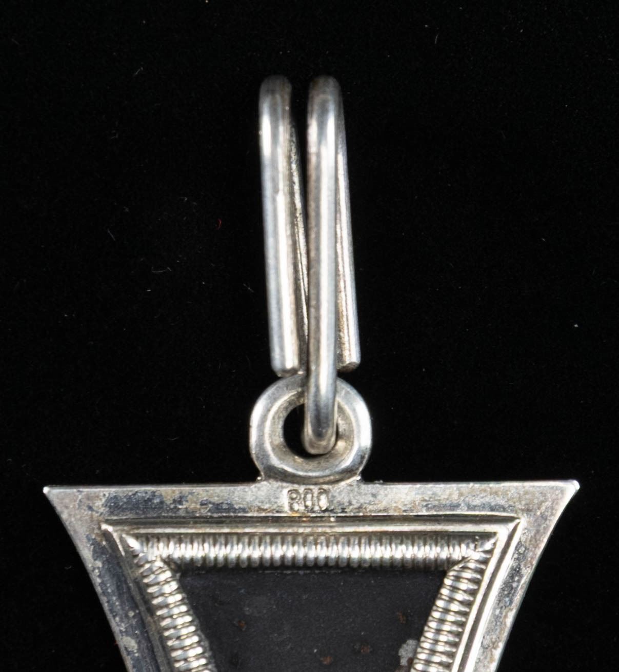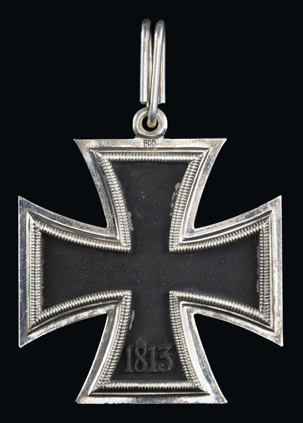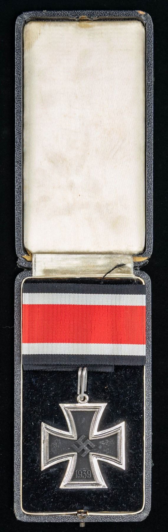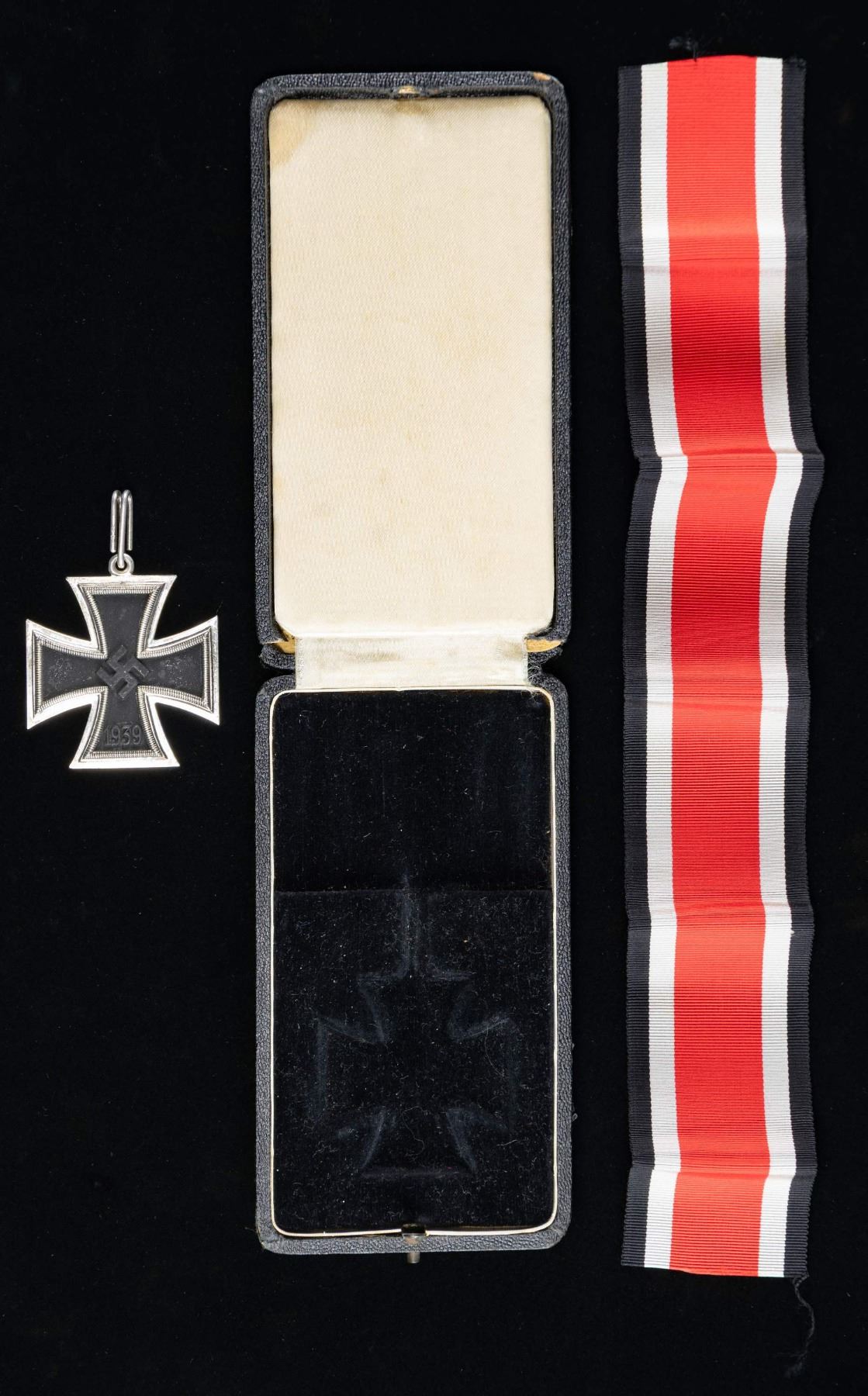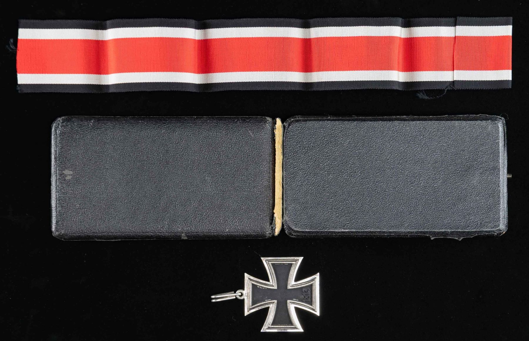 A wonderful original WWII German Knights Cross of the Iron Cross in its original black velvet-lined issue case that is covered in thin black patterned leather. The case measures 6" x 3 1/4" and the inner lid has a cream colored silk pad. The cross itself has a black center with a silver border, ring, and loop. The reverse is marked " 800 " just below the ring. The elongated oval silver loop is marked " 65 " and " 800 ", indicating manufacture by Klein & Quenzer of Idar-Oberstein, just east of Luxembourg. A nearly 16" length of neck size ribbon is folded at the top of the case. CONDITION: medal and ribbon show nearly no wear and are in superior condition. The case shows significant storage wear, and the hinged spine is broken but complete and likely repairable. Truly a magnificent example worthy of the most advanced collection. PROVENANCE: Estate Collection of John "Jack" Dhooghe. (02-25578-1/BF). NON-GUN. $8,000-12,000.