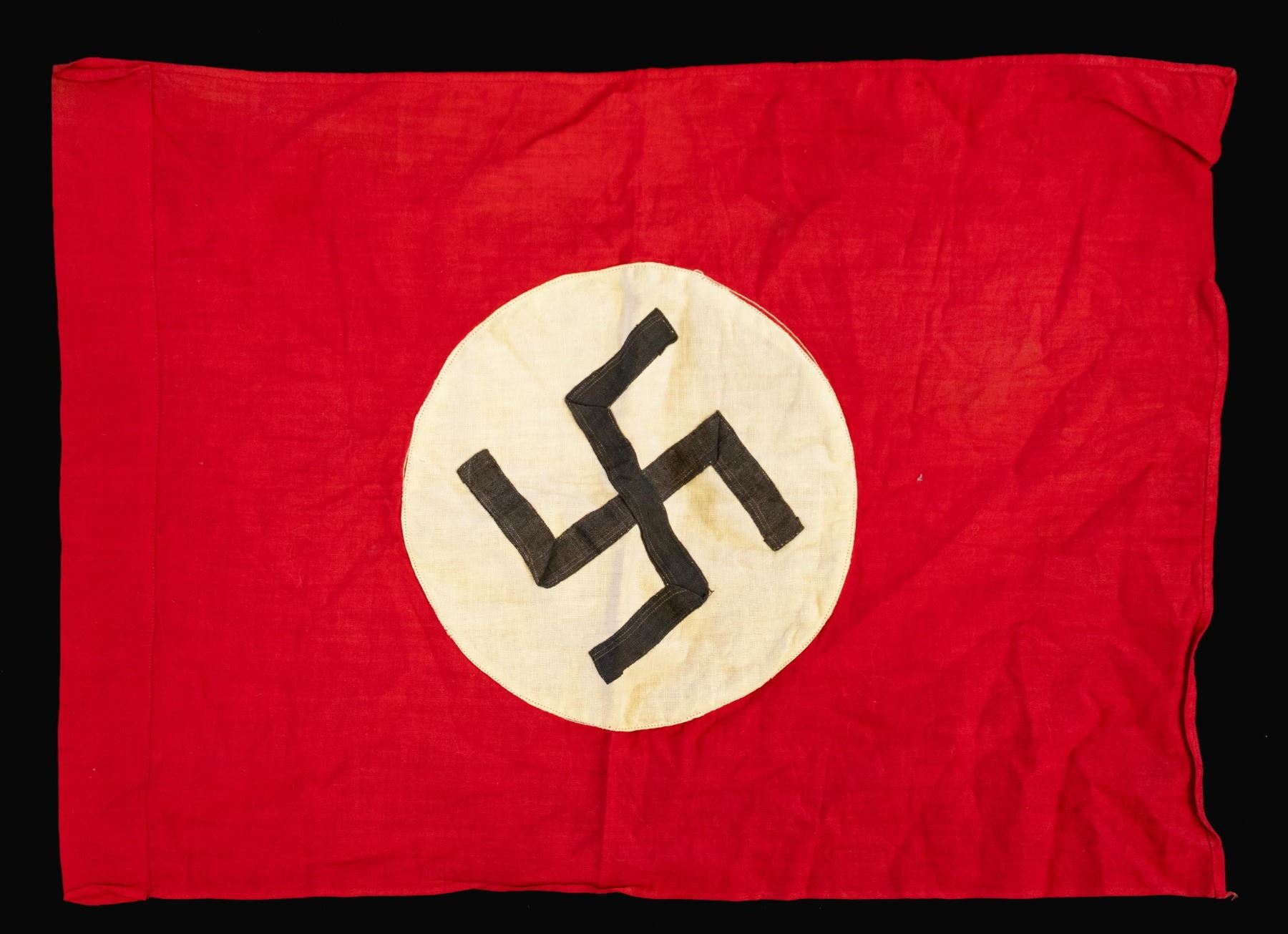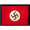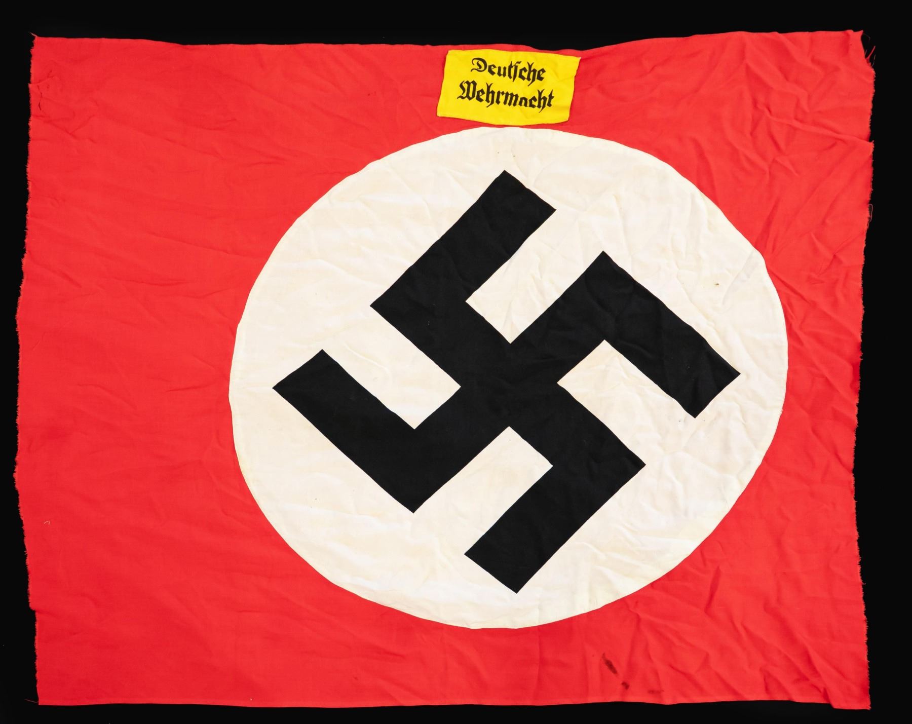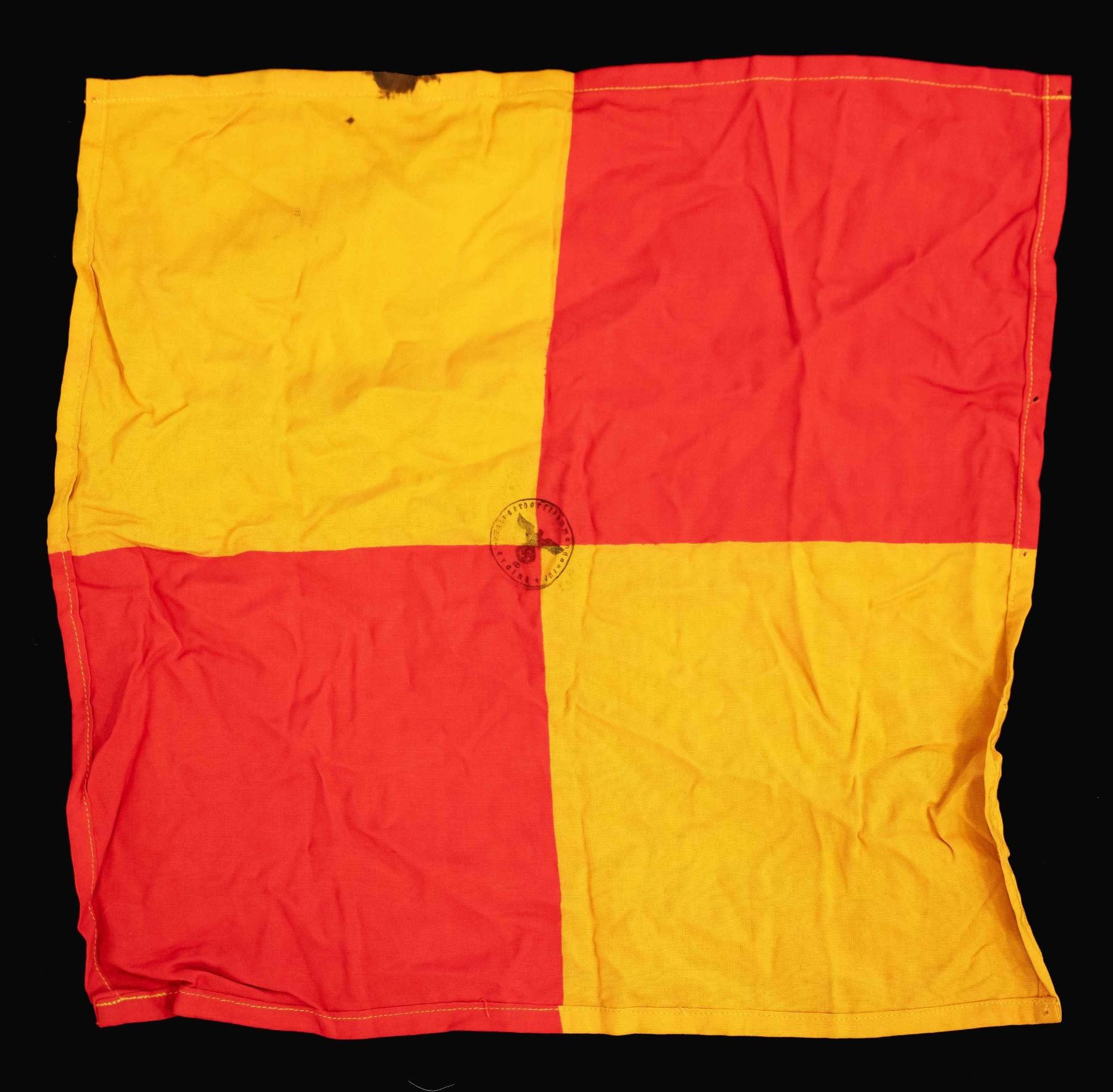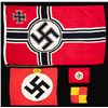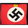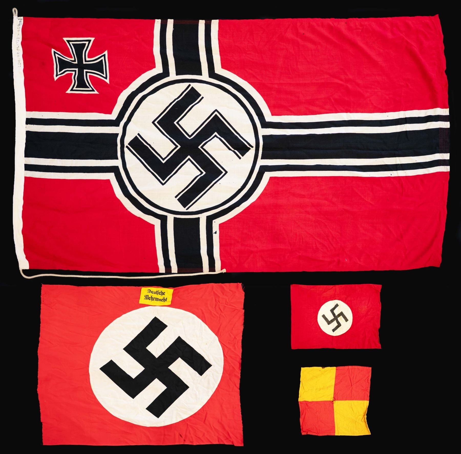 AND MORE. This group includes 1 Kriegsmarine battle flag measuring approx. 96" x 58". The flag is of standard design with an internal rope halyard. The hoist is marked with a Kriegsmarine eagle over "M" & "LOH . KR-FL.150 X 250". CONDITION: flag appears unissued but does have scattered very minor moth damage. / 1 small party flag measuring approx. 20" x 15". The flag features a sewn black party symbol on a sewn white circular disk, all on a red field. CONDITION: flag generally shows light wear with minor darkening. / 1 partial party flag measuring approx. 44" x 35 1/2", featuring a printed party symbol on a sewn white circular disk, all on a red field. Sewn to the flag, above the central disk, is a printed black and yellow "Deutsche Wehrmacht" arm band. CONDITION: the flag shows no appreciable damage and minor staining. However, both edges are raw, indicating the flag was likely torn down when captured. / 1 yellow and red signal-type flag of undetermined origin and date. The center of the flag has a WWII German ink stamp with eagle. CONDITION: flag show light wear overall. (02-23864/BF). $500-800.