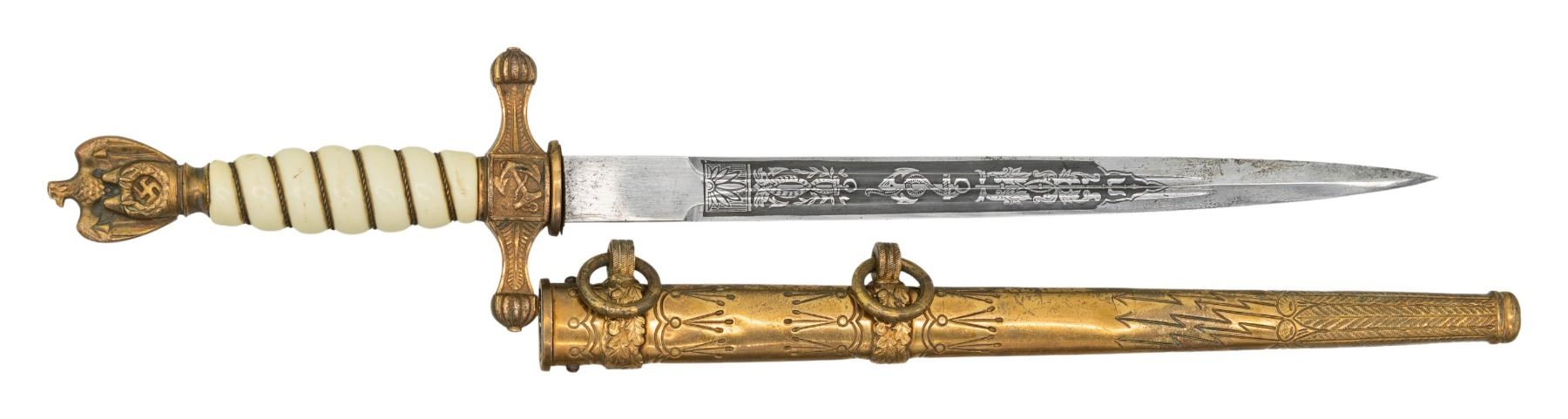 A very good WWII German Navy dagger measuring 16 5/8" overall with an etched blade that includes foliate and nautical motifs. The blade is marked "(logo) ORIGINAL EICKHORN SOLINGEN" with the 1941-42 mark. Gilded brass hilt with an anchor on the crossguard and a fully articulated eagle pommel. Wire wrapped cream colored grip, Gilded brass scabbard with the lightning bolt motif. CONDITION: blade shoes original factory polish with some very minor staining. Hilt show slight wear to the gilded finish and the grip is undamaged. Scabbard is nice with only one very shallow dent. (02-26158/BF). NON-GUN. $700-900.