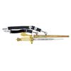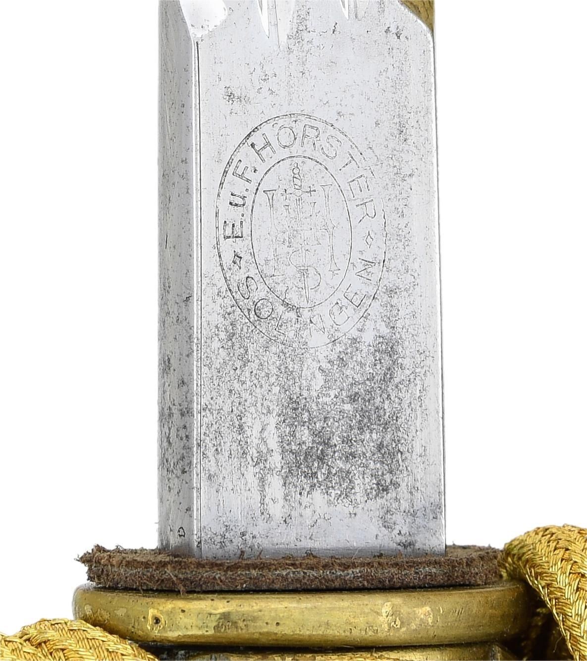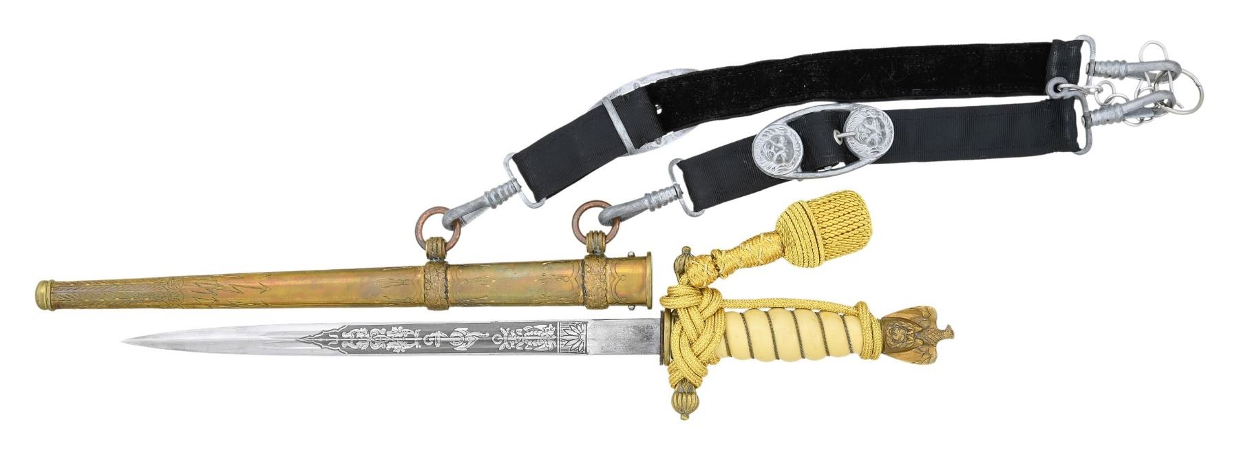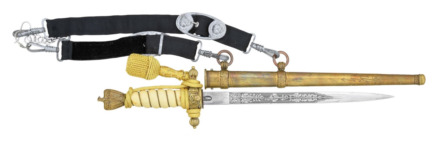 A very fine example of a WWII German Kriegsmarine dagger measuring 16 3/4" overall. Blade is etched with nautical and foliate motifs and is marked " E. u. F. HORSTER * SOLINGEN * (logo) ". Gilded brass crossguard and pommel featuring an eagle clutching a wreath and party symbol. Wire wrapped cream colored grip with gold bullion dagger knot attached. Gilded brass scabbard with classic lightening bolt motif and orginal hanger attached. CONDITION: blade shows substantial original factory polish, and the hilt shows very light overall wear with traces of original gilded finish remaining. Scabbard also shows light wear with traces of gilded finish extant. (02-24437-2/BF). $800-1200.